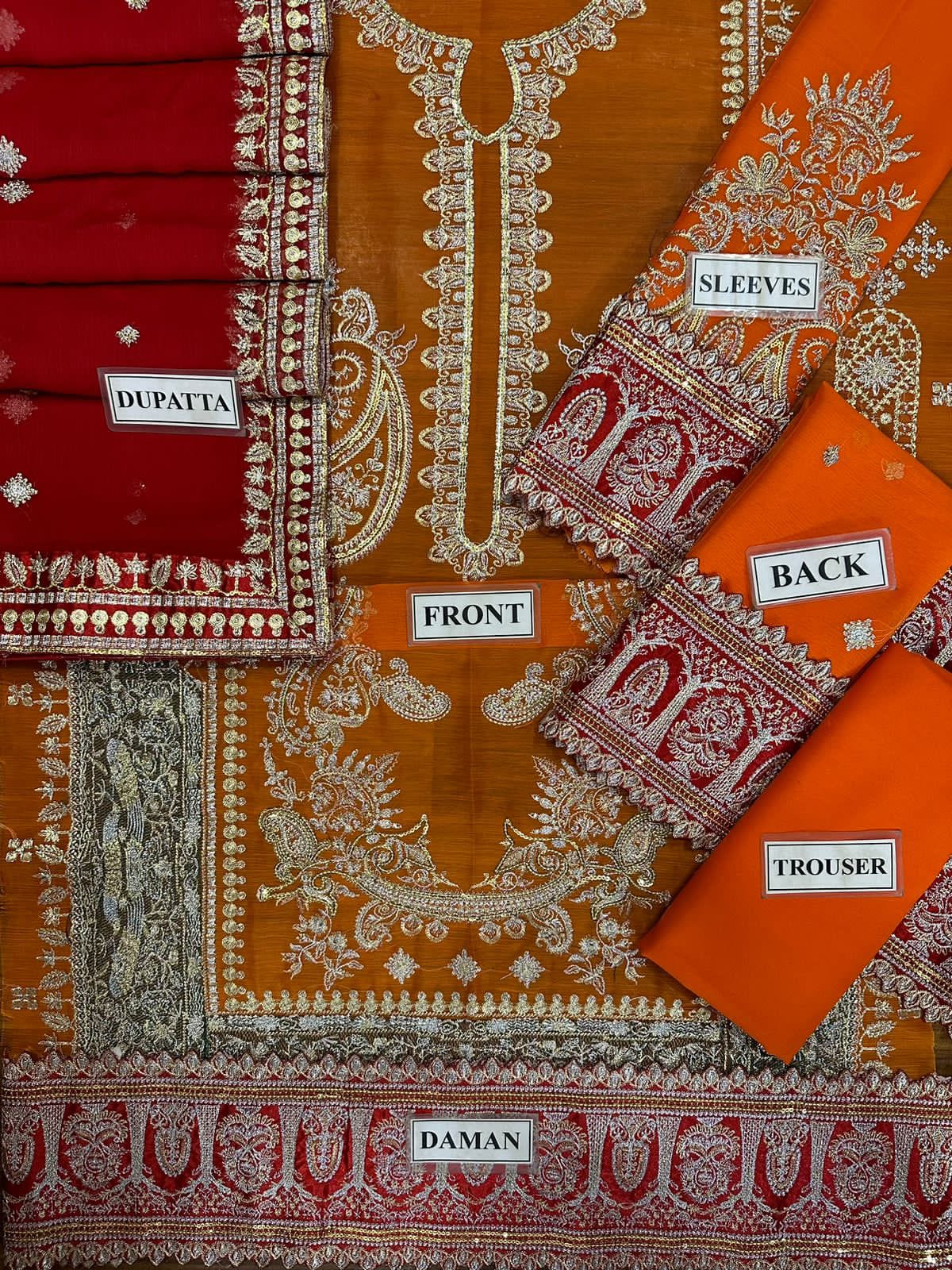 Front full heavy embroidery on chiffon stuff along with daman patch for making long length shirt