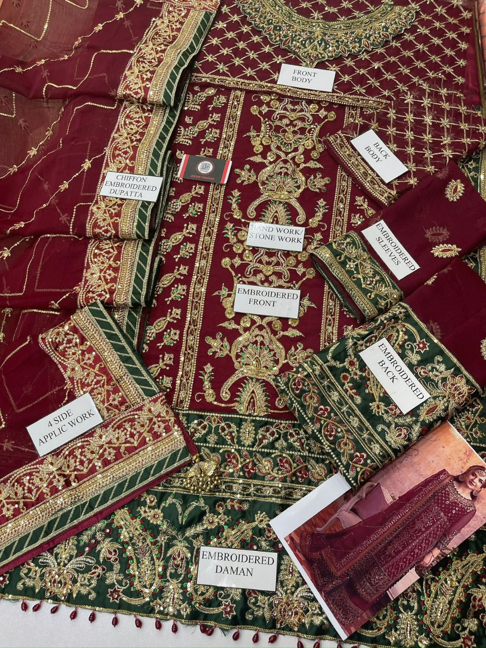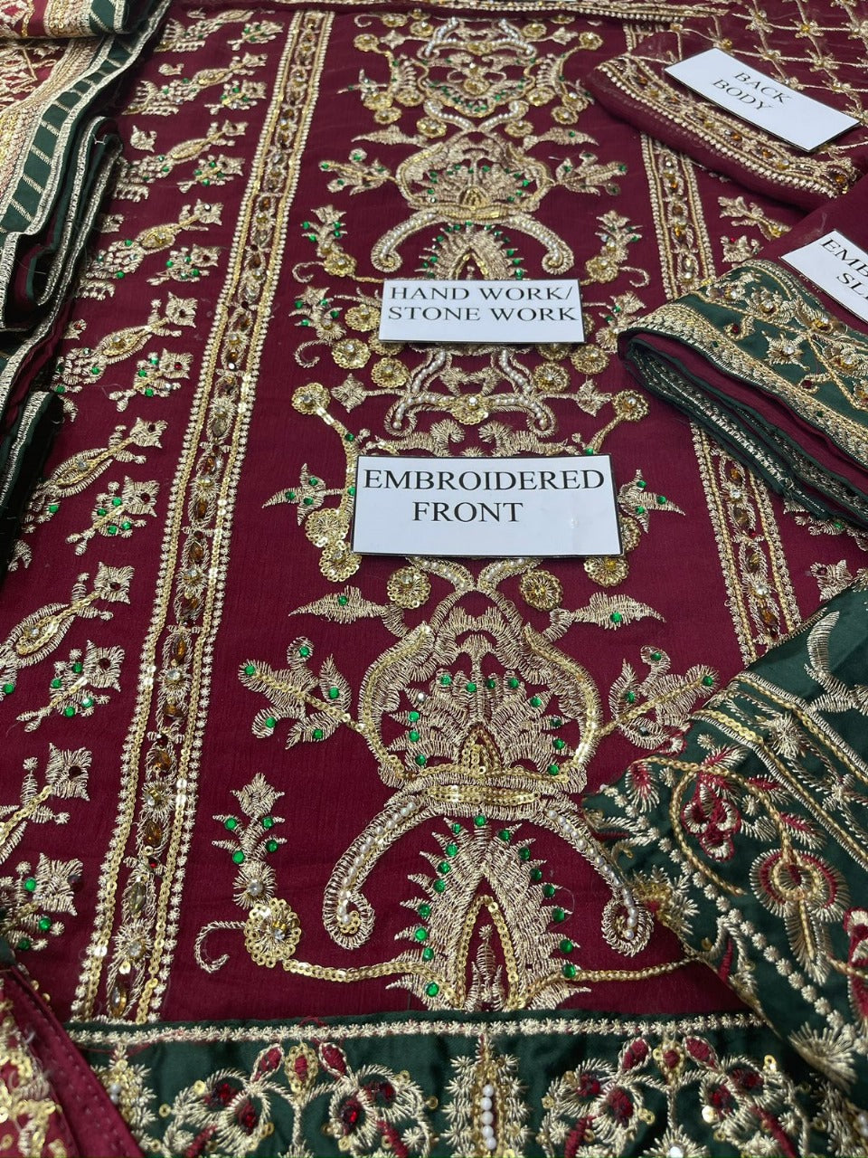 FRONT EMBROIDERED ON CHIFFON WITH DAMAN BORDER APPLICED ALONG WITH HANDOWRK AND STONE WORK