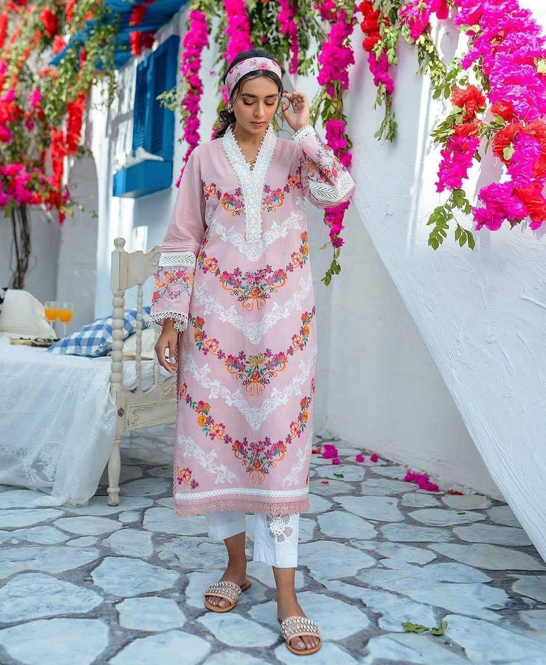 Multi Thread Embroidered Paper Cotton Sleeves & Milky Lace
