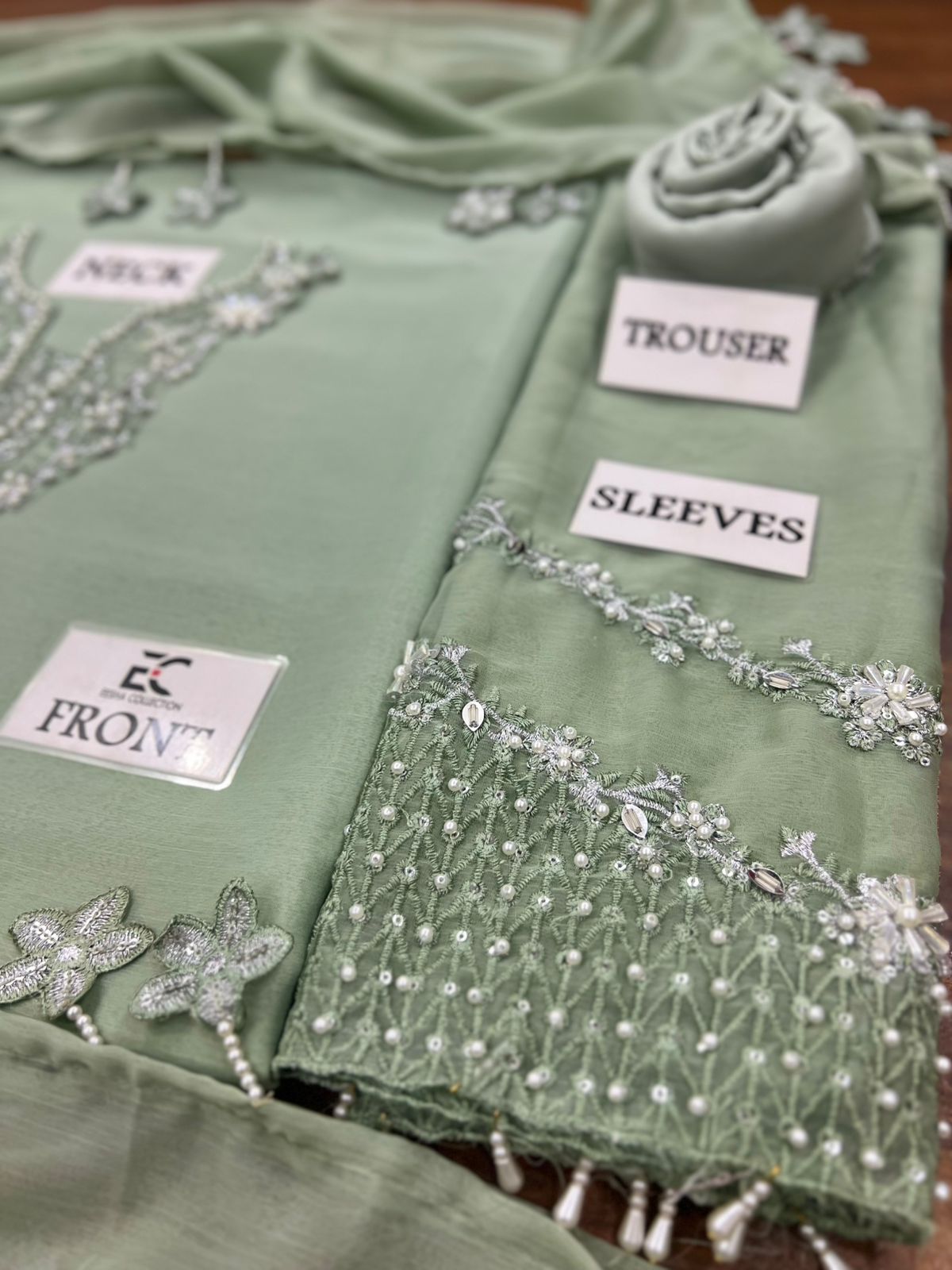 CHIFFON HEAVY ALTERNATE EMBROIDERED SLEEVES WITH HEAVY ADDA WORK CUFF ON FABRIC WITH HANGING TUSSLE