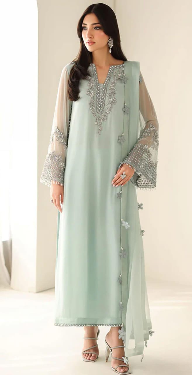 Chiffon Dupatta With Hanging Embroidered Flowers