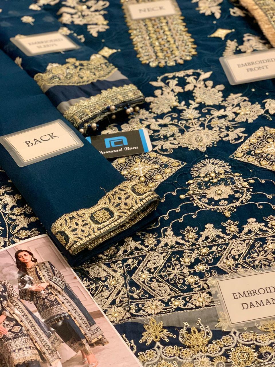 ORGANZA 9mm EMBROIDERED SEQUENCE FRONT EMBELISH WITH HANDWORK AND HANGING TUSSLES ON DAMAN
