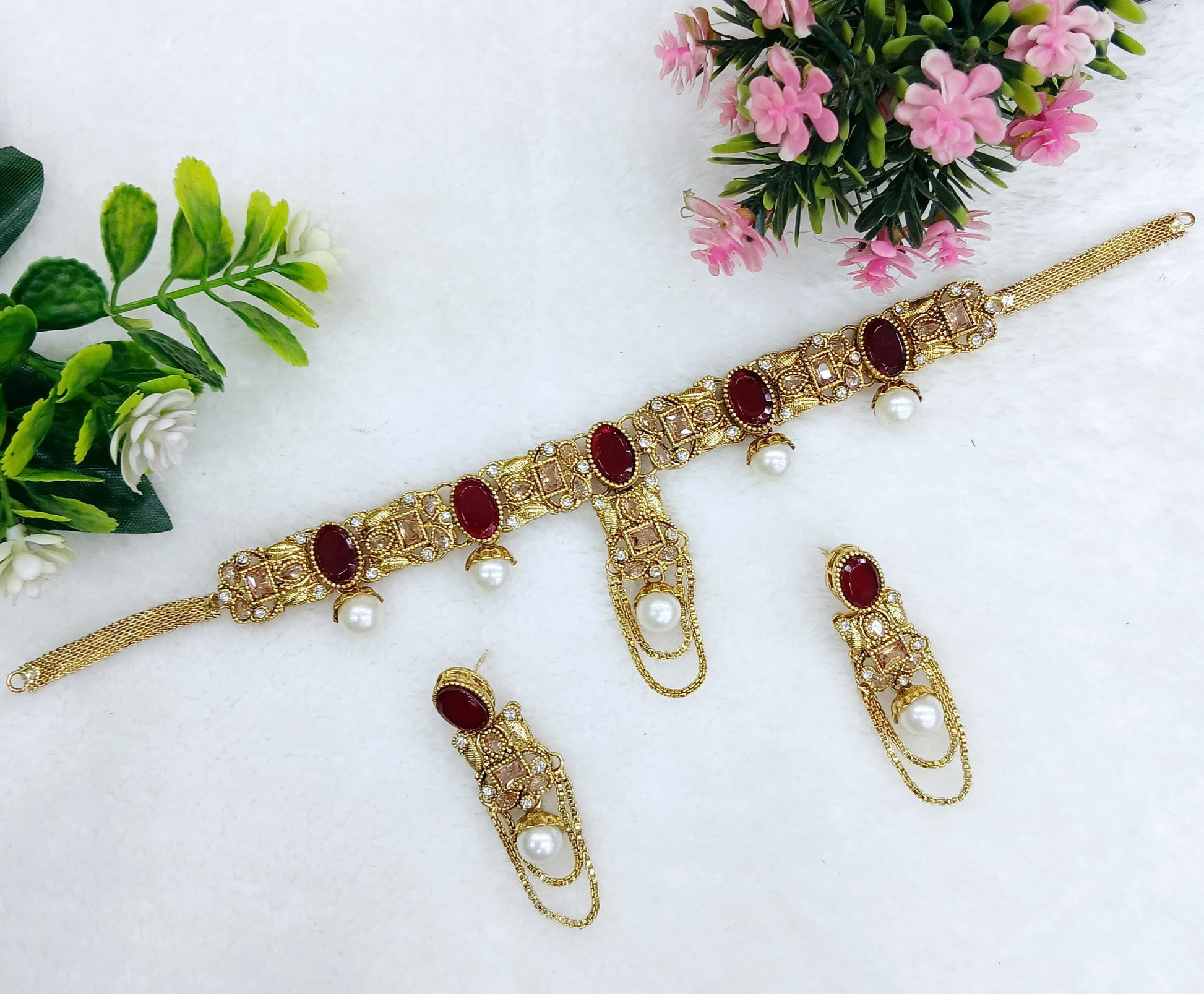 DEMANDABLE CHOKAR WITH BEAUTIFUL PEARL AND GLASS ZARCON WORK AND EARRINGS