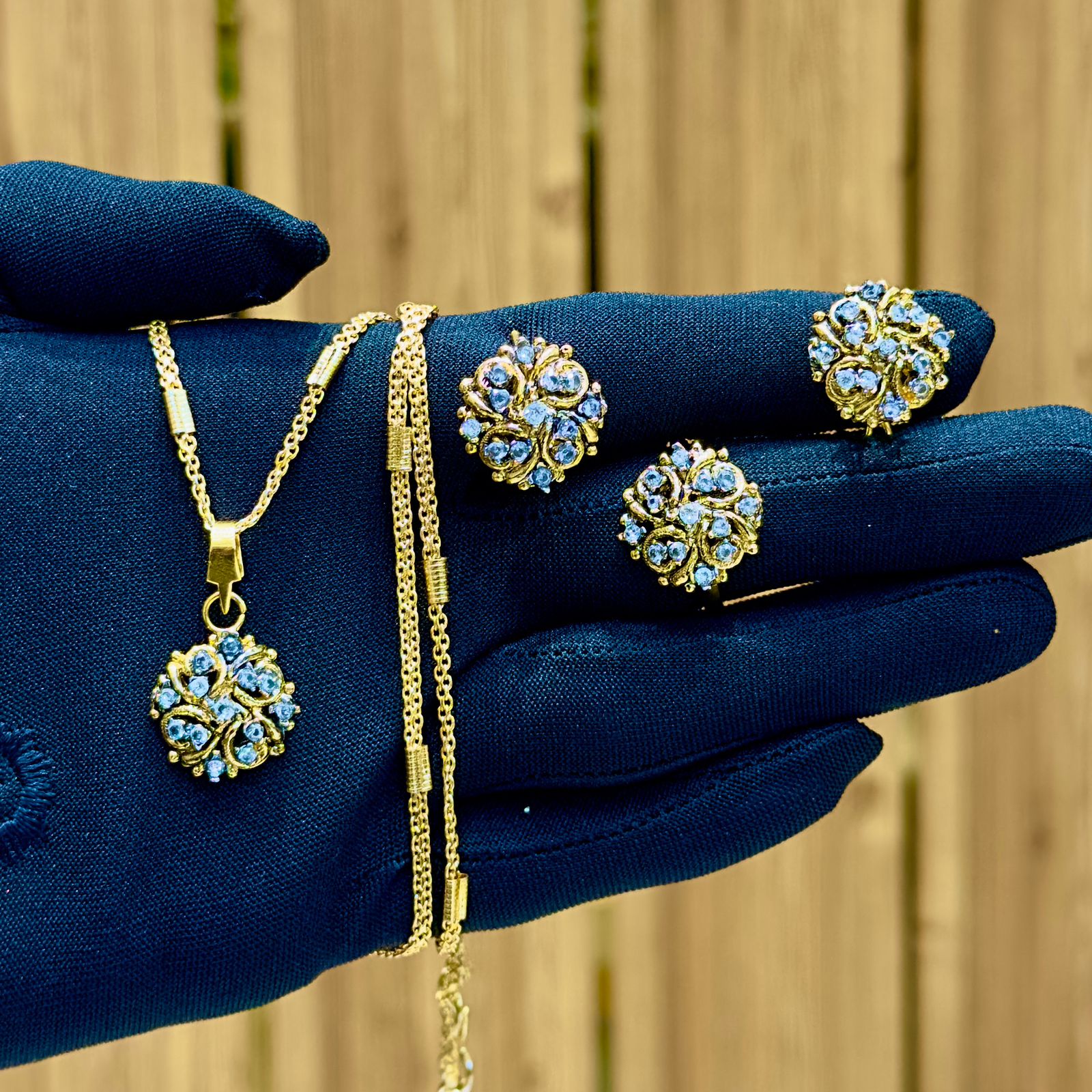 *Regal Adornment* combo set, featuring a stunning Zircon pendant, earings and adjustable ring, all adorned with a luxurious gold polish finish