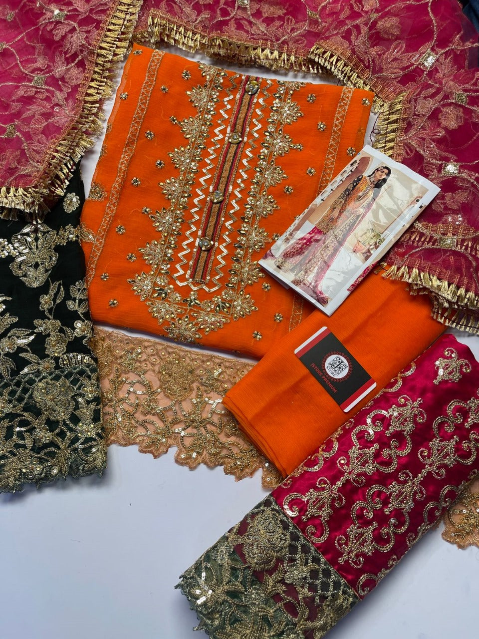FRONT HEAVY EMBROIDED CHIFFON FRONT WITH EMBROIDED DAMAN ALONG WITH HAND WORK