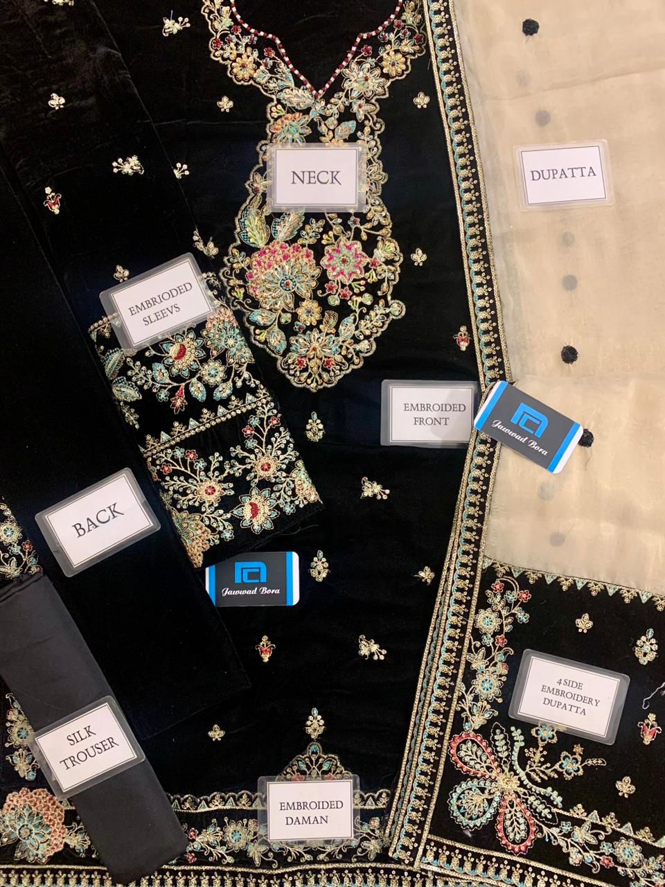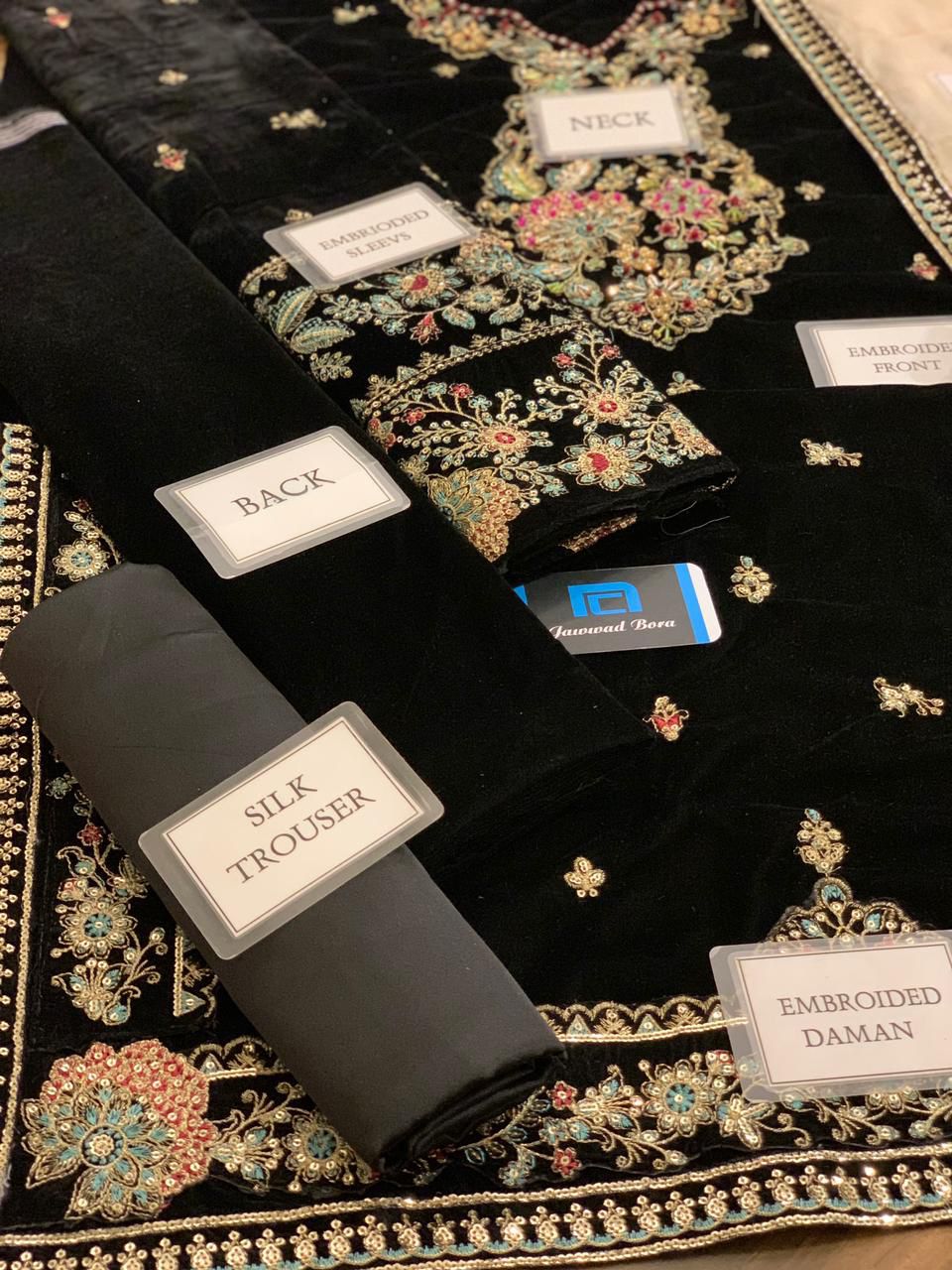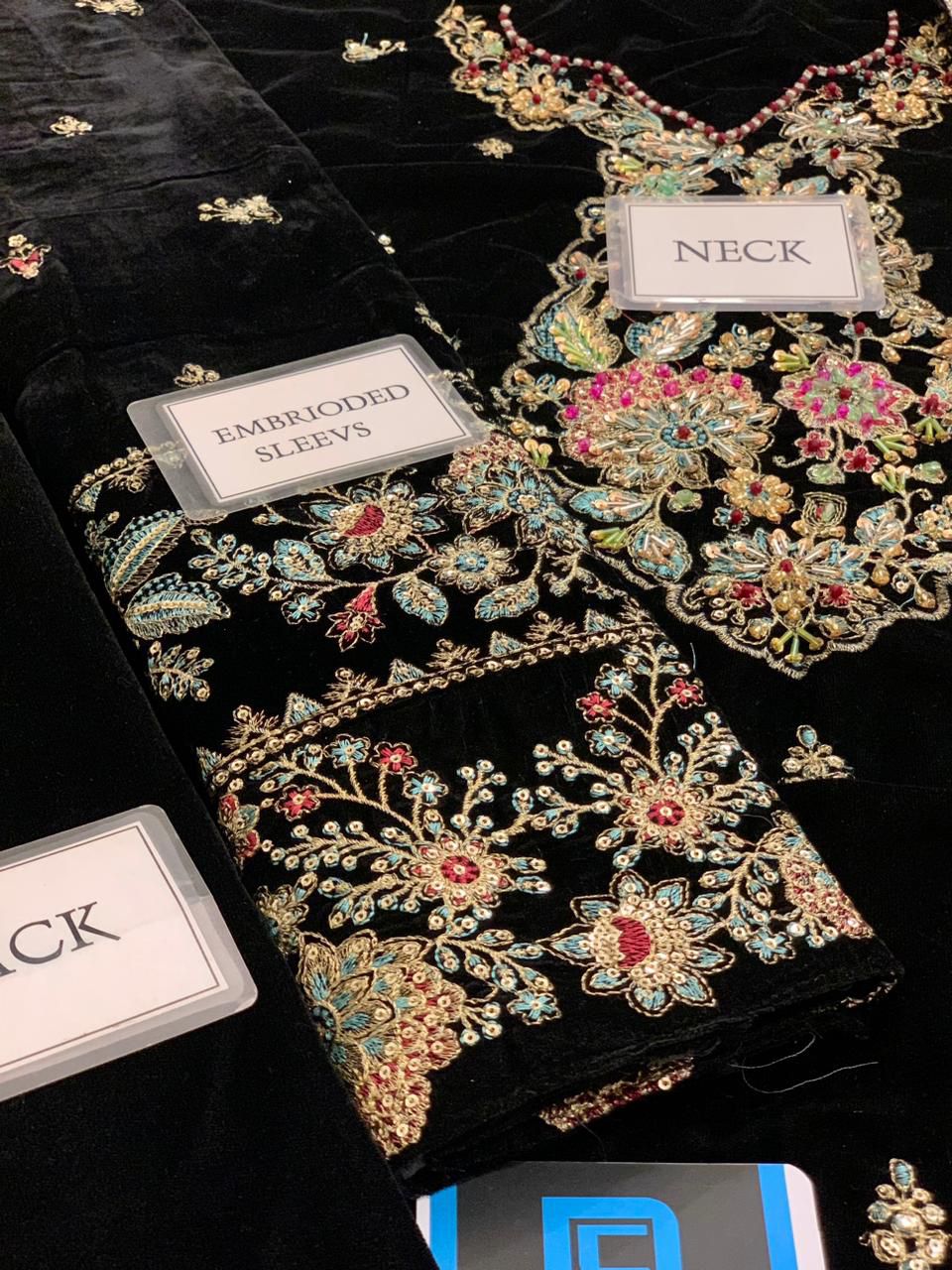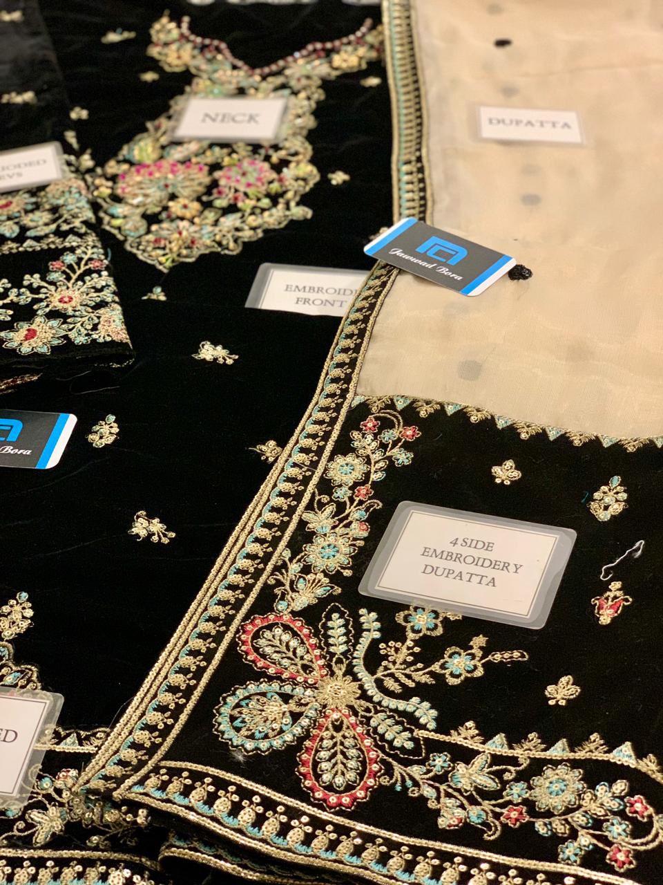 *velvet fully heavy alternet embroidered spengle work front with fully hand emblishment adha work neckline with velvet fully heavy embroidered spengle work daman boarder & chak boarder & chak lace*