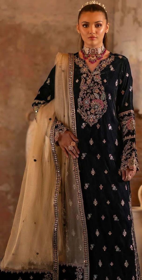 *velvet fully heavy alternet embroidered spengle work front with fully hand emblishment adha work neckline with velvet fully heavy embroidered spengle work daman boarder & chak boarder & chak lace*