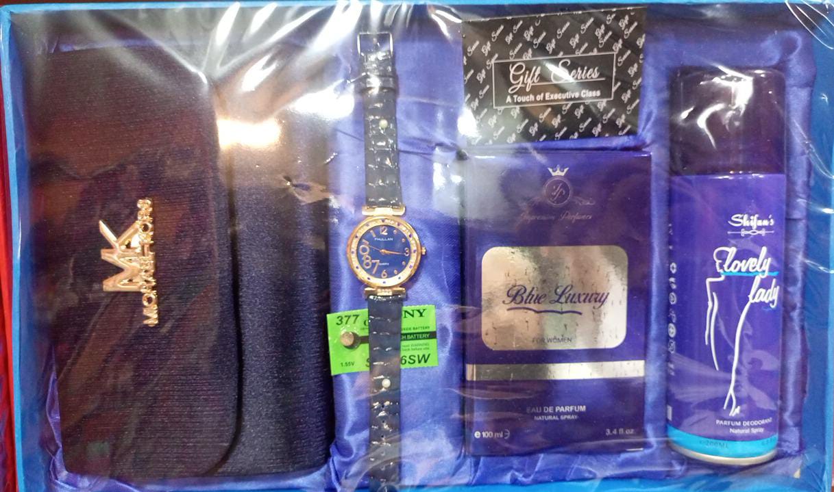 *Perfume gift set pack of 4pcs 200ml body spray, 100ml perfume, watch, fancy clutch*