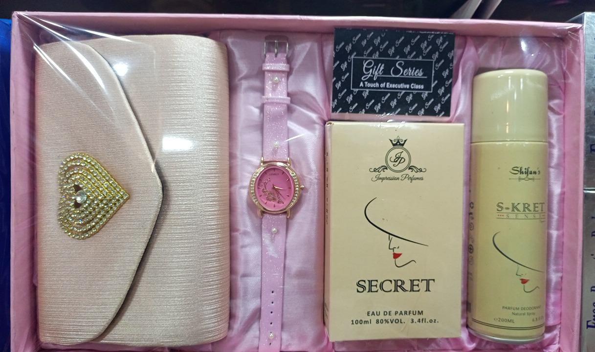 *Perfume gift set pack of 4pcs 200ml body spray, 100ml perfume, watch, fancy clutch*