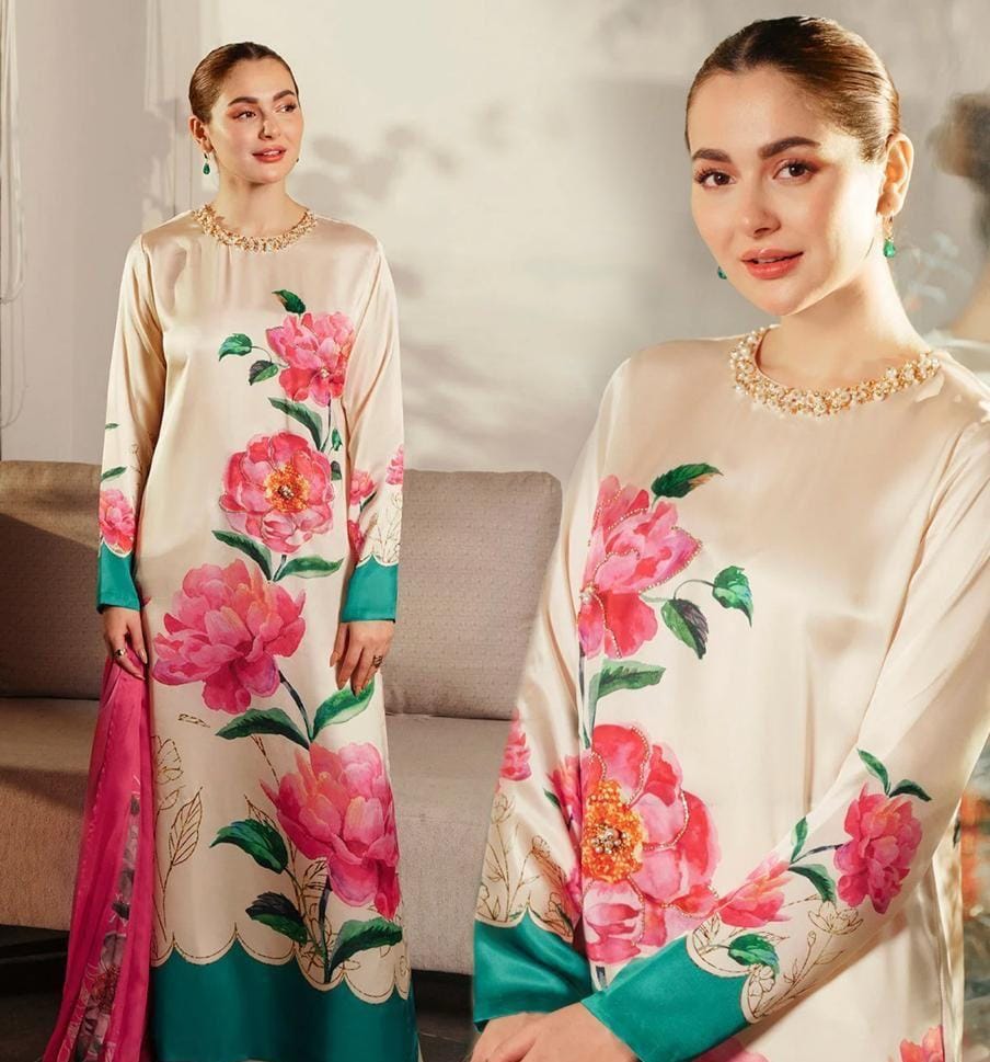 SHAMOZ SILK DIGITAL PRINT FRONT WITH HANDWORK HANDWORK STICHED WITH THREAD NOT PASTED
