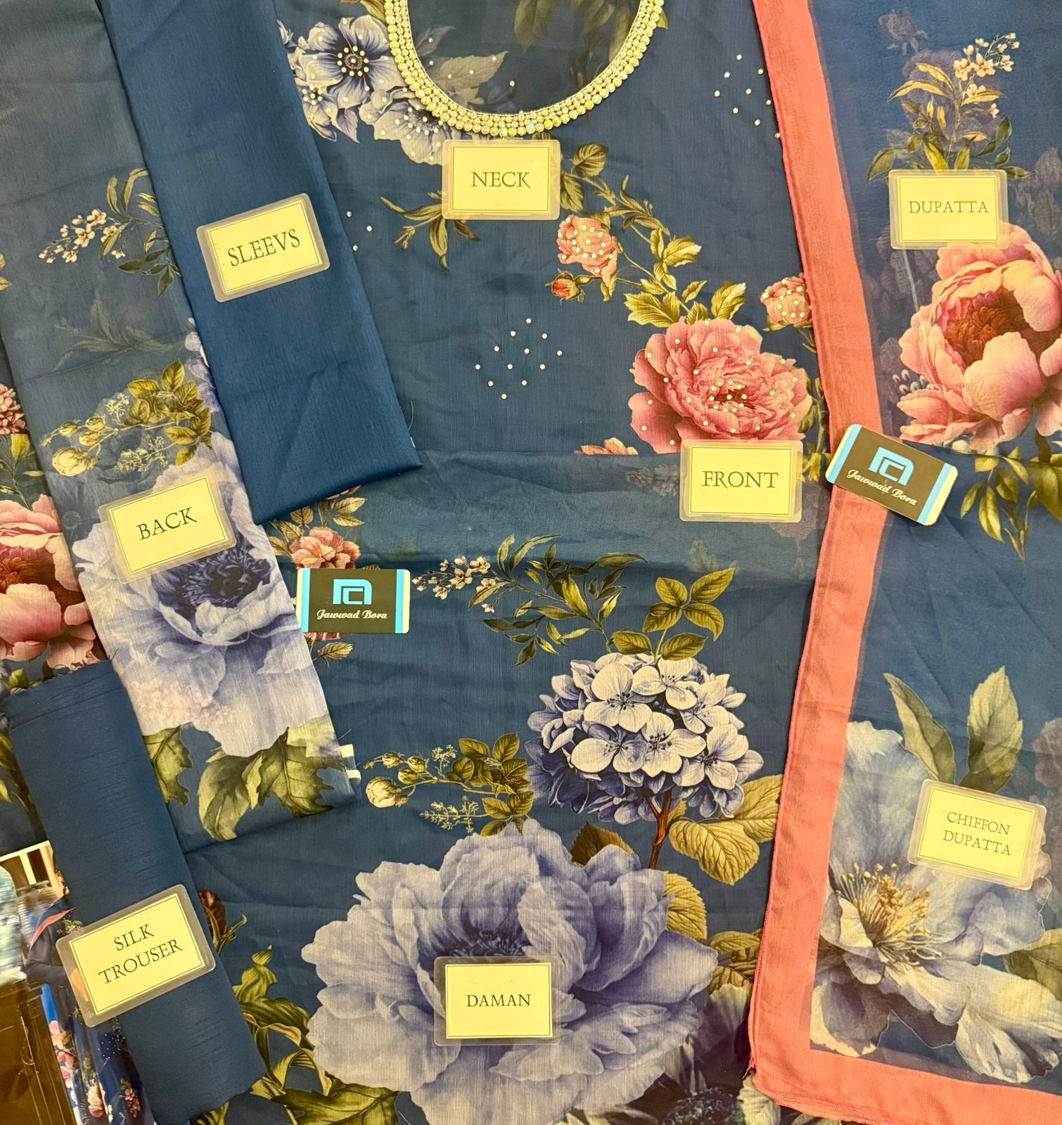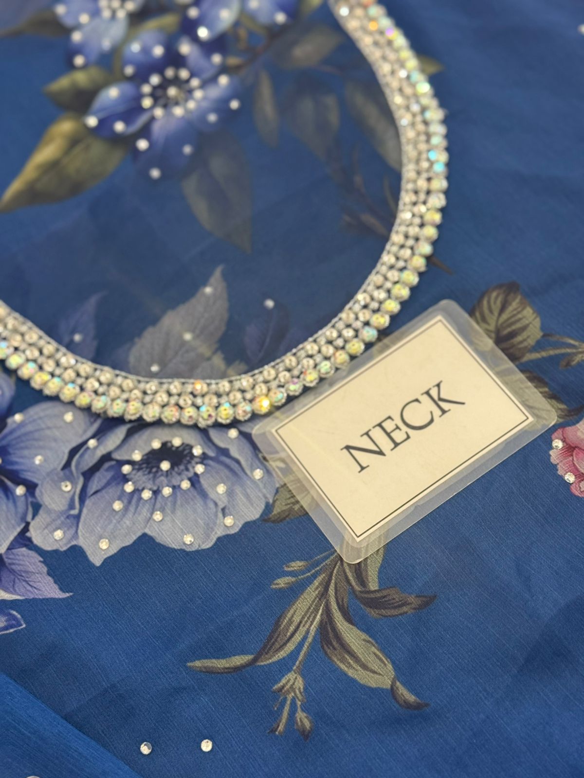 Chiffon Digital Printed Front With Crystal Diamond Spray Work With Hand Emblishment Adda Work Neckline