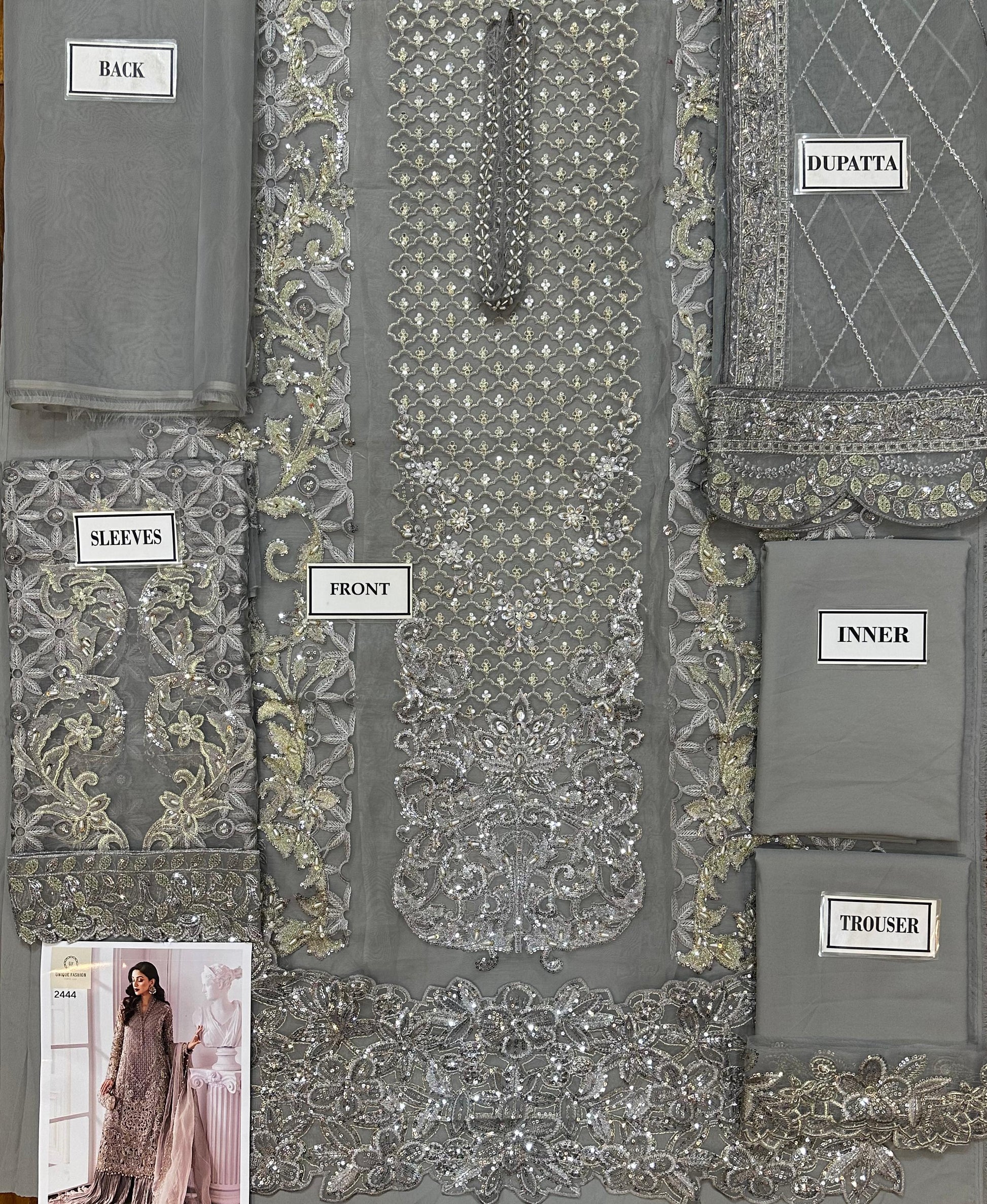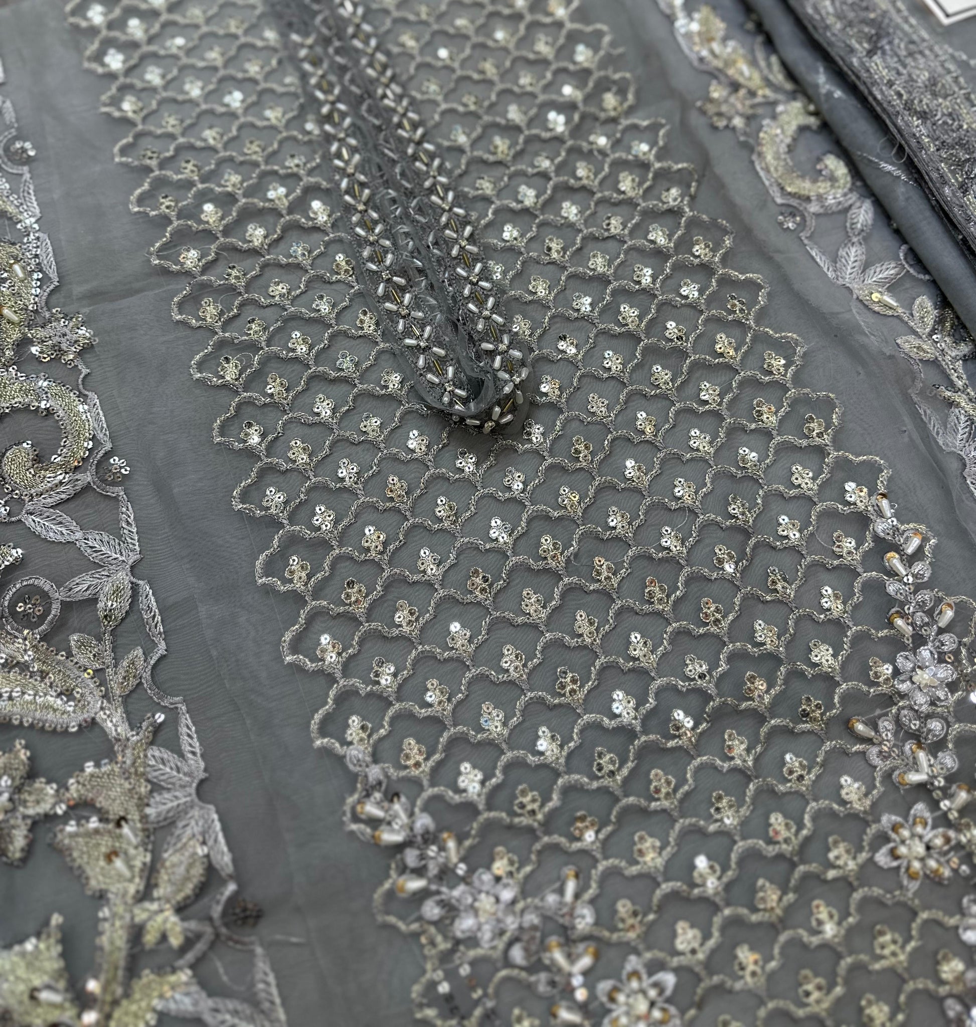 Organza embroidered front left pannel with Hand embellished.
