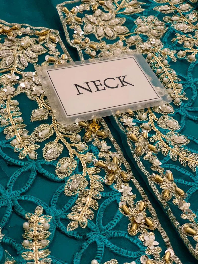 The organza dupatta showcases full spray embellishment work and a four-sided, heavily embroidered sequin border with full cutwork.Â