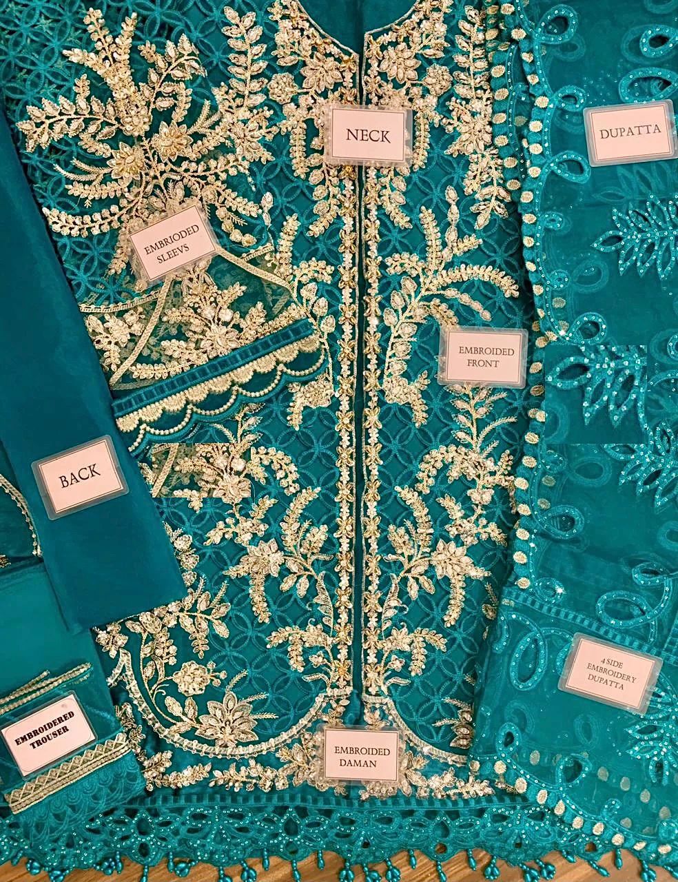This stunning design features a fully heavy embroidered organza front with sequin work on both the right and left panels. It boasts intricate hand-embellished 'adha' work and a heavily embroidered sequin daman border with delicate cutwork and hanging tassels. 🧵 The back is crafted from plain organza.