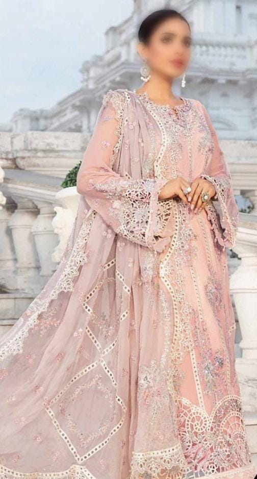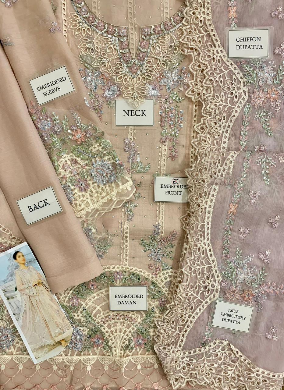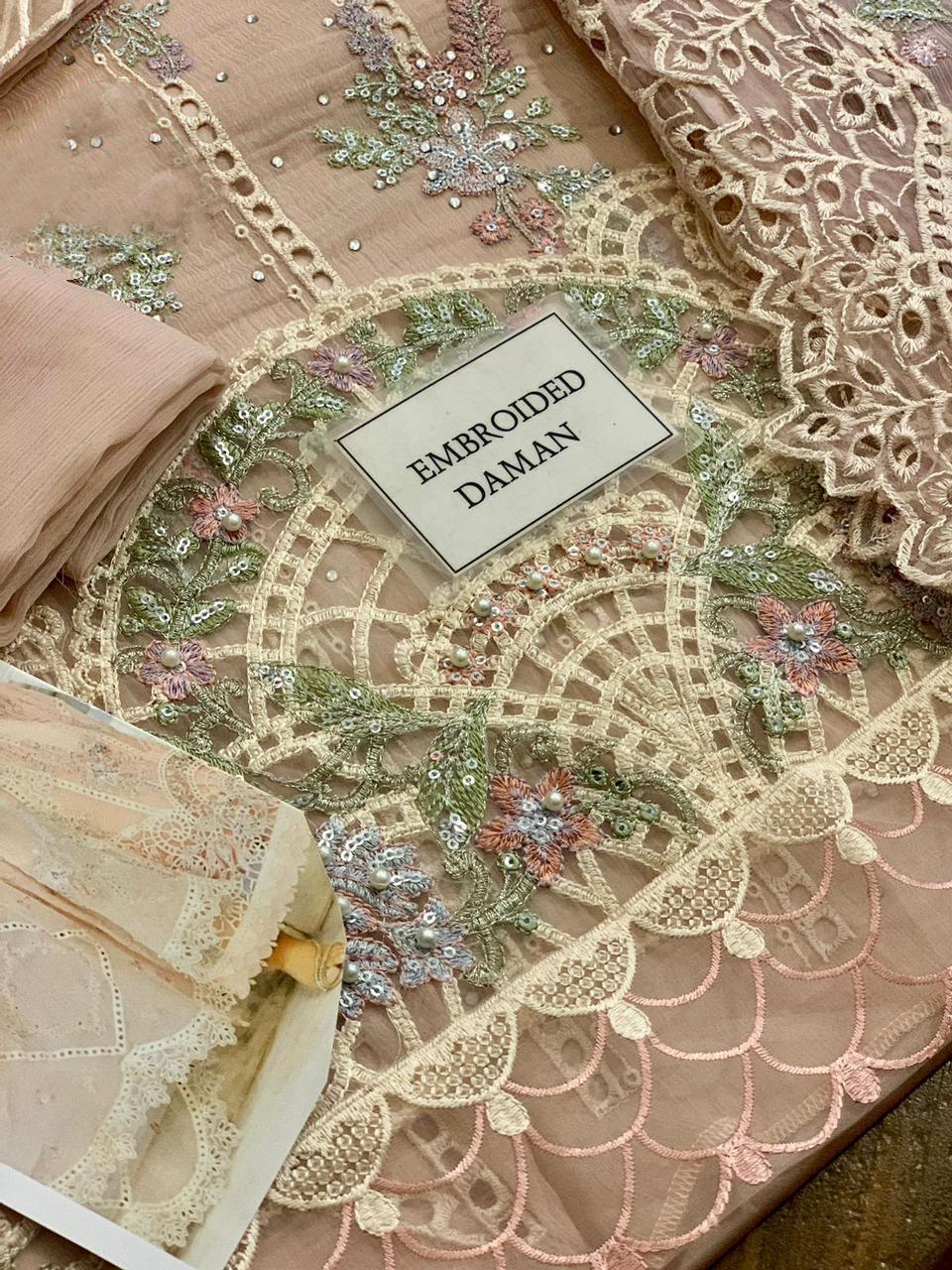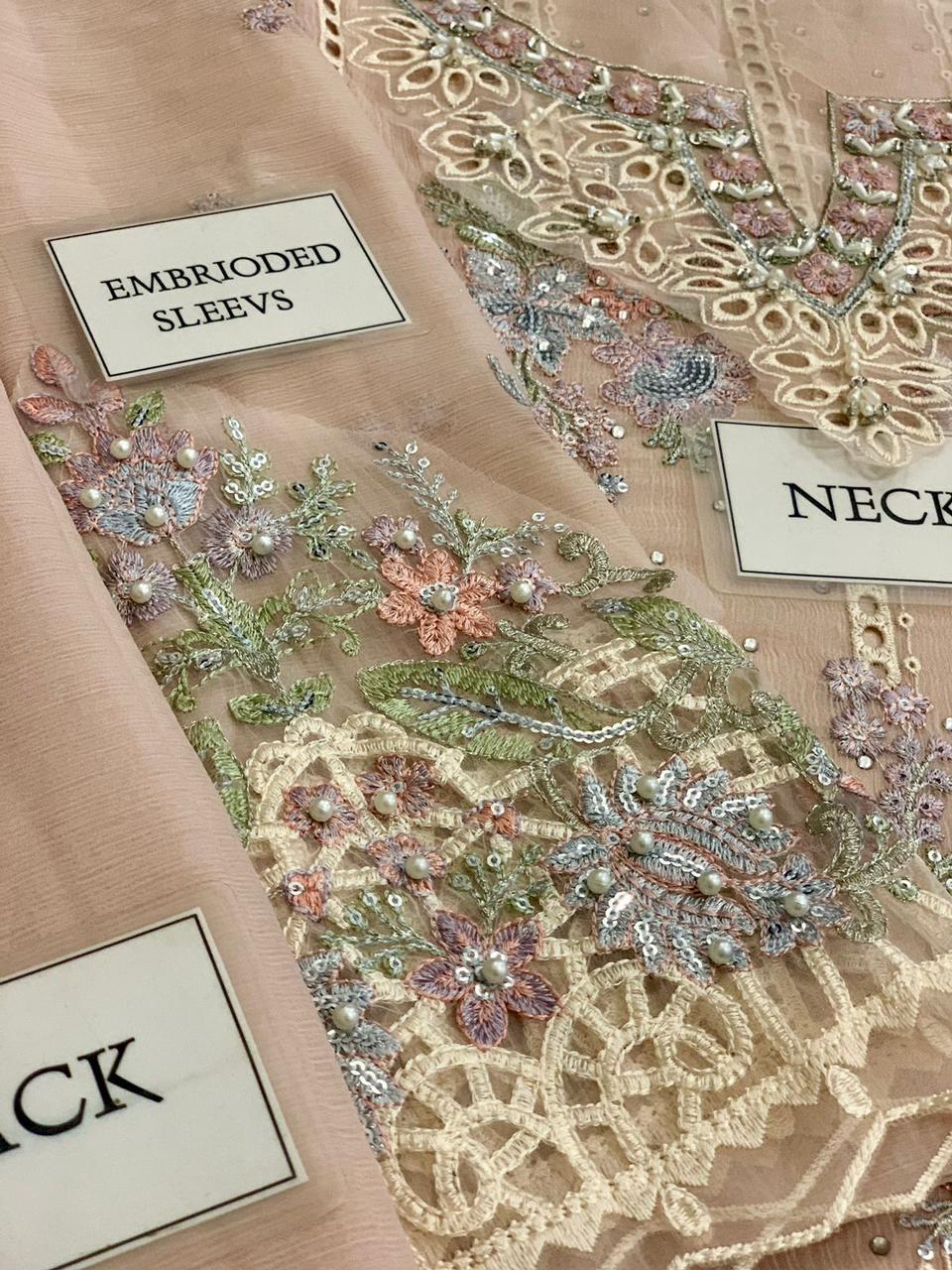 chiffon fully heavy embroidered scifflie & spengle work with fully sprey emblishment centre panel with embroidered neckline with fully hand emblishment adha work with fully heavy embroidered scifflie left & right panel attach with heavy embroidered spengle work daman boarder with cut work & fully beats work