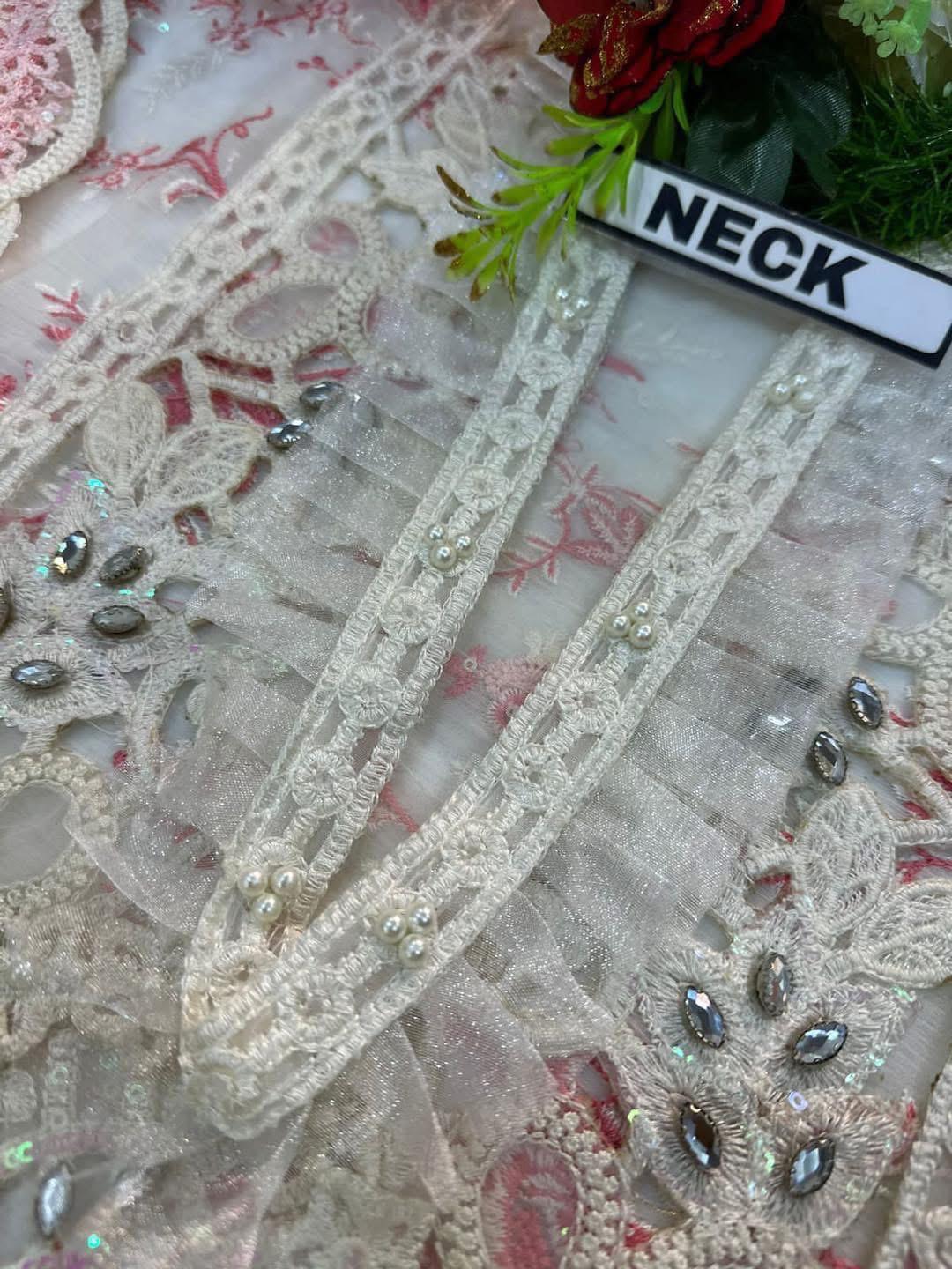 ●NECK EMBROIDERED With Frill Lace, Punching Ball’s ,3D Flowers, Addawork , Handwork & Cutwork