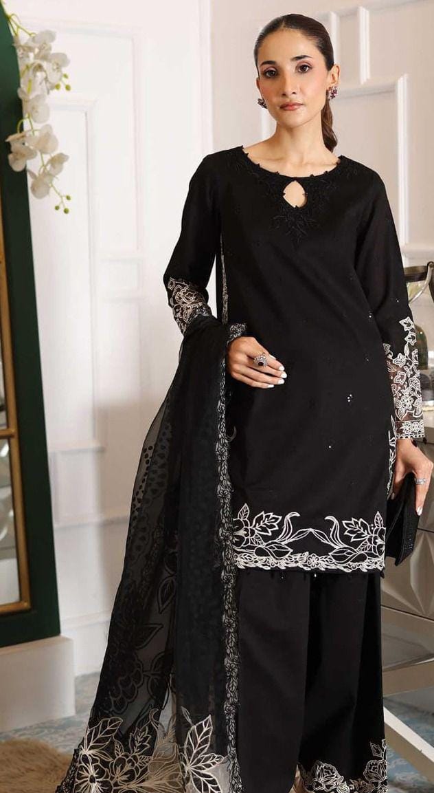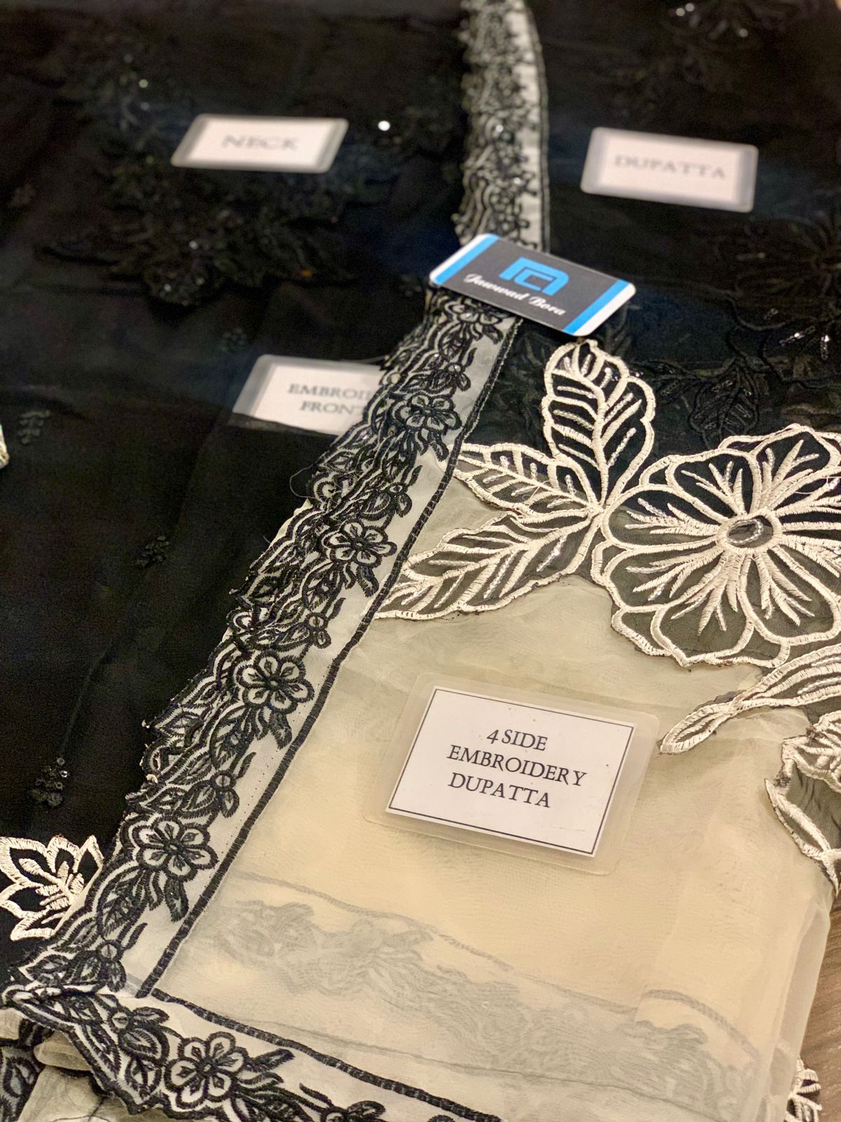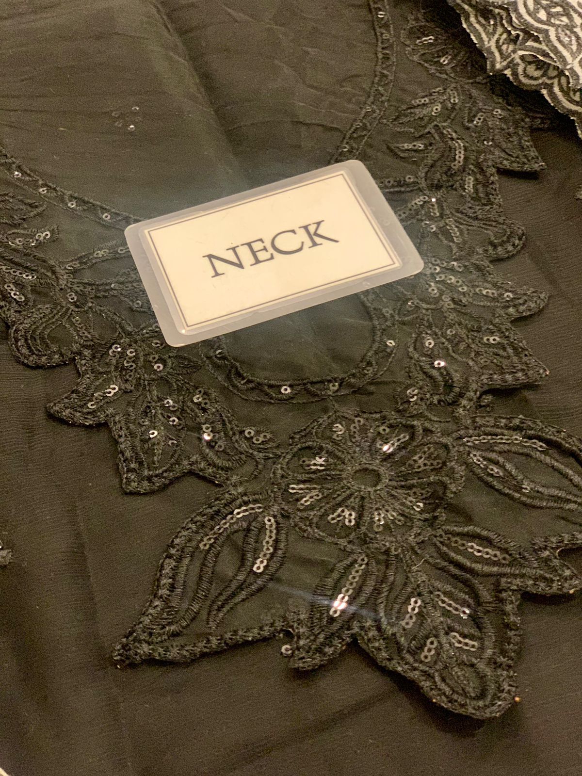 *Chiffon fully embroidered spangle work front with embroidered spangle work neckline with heavy embroidered spangle work chak bunches with heavy embroidered spangle work daman border*
