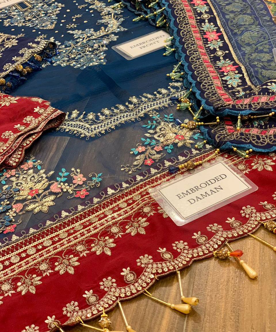 *chiffon fully heavy embroidered spengle work centre panel front with hand emblishment work with 2 type heavy embroidered spengle work daman boarder with heavy fancy tulses attachment with plain side panel with heavy embroidered spengle work side panel bunches*