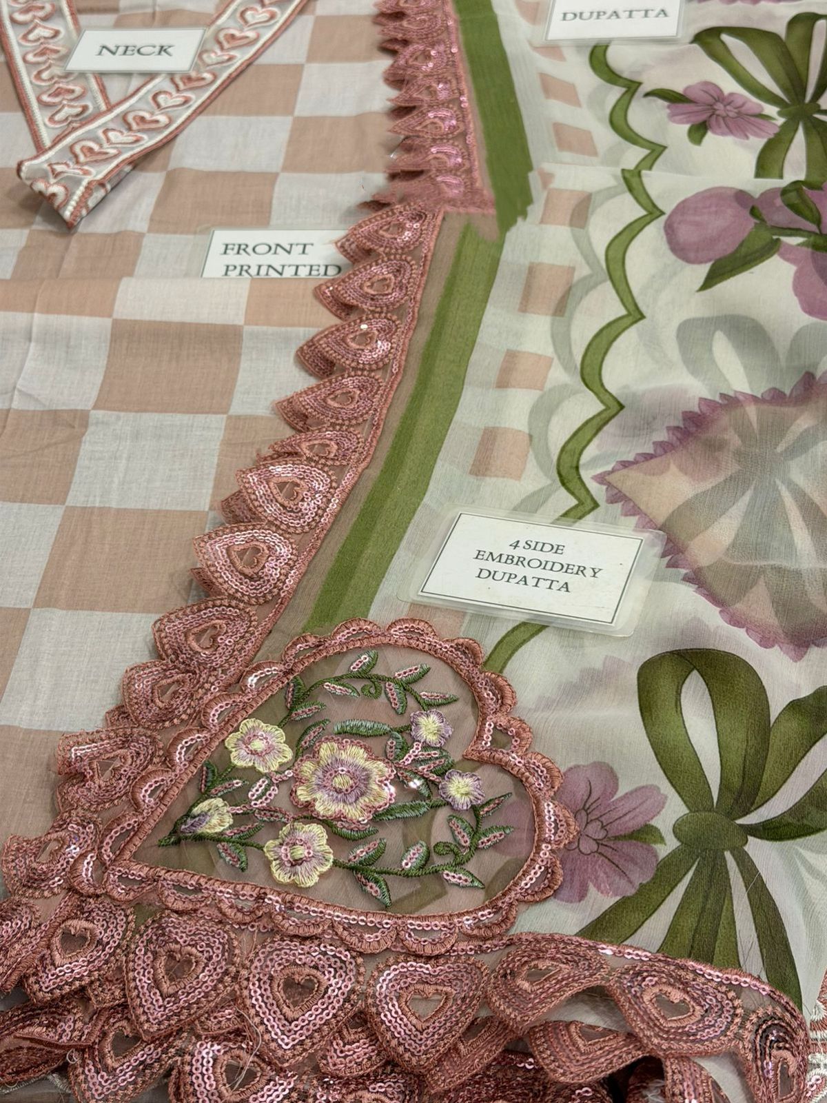 *Printed chiffon dupatta with 4 side heavy embroidered spengle work duphta boarder attach with 4 side bunches attach*