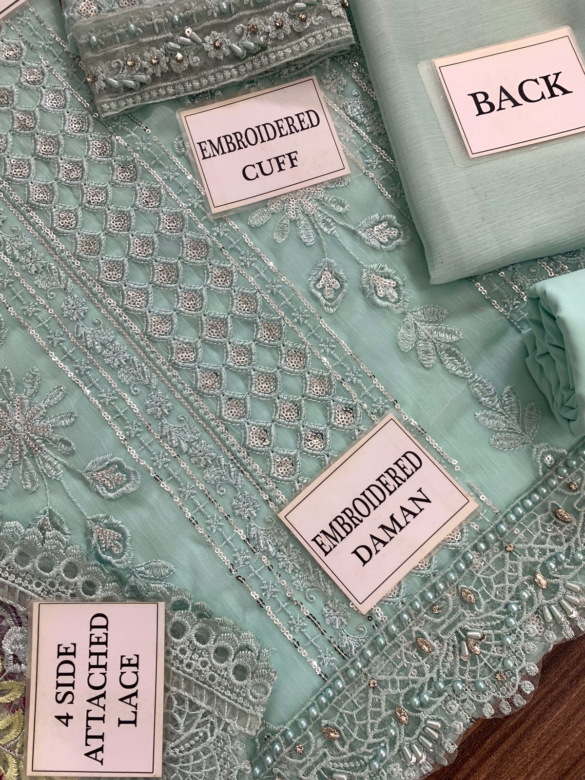 HEAVY EMBROIDERED CHIFFON FRONT WITH EMBROIDERED NECK PATCH EMBELLISHED WITH ADDA WORK AND STONE WORK ALONG WITH CUTWORK DAMAN HEAVY SEQUENCE EMBROIDERED WITH ADDA WORK AND STONE WORK