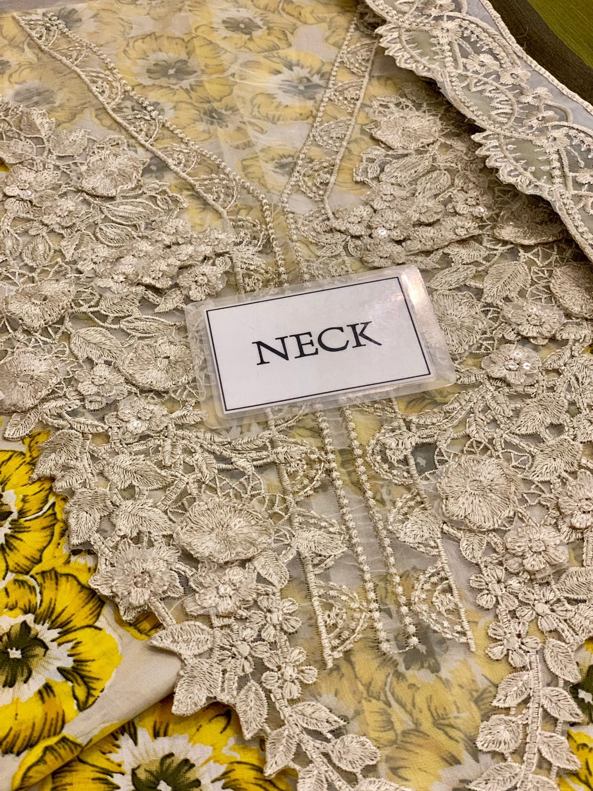 printed lawn front with fully heavy embroidered spengle work neckline with 3D embroidered spengle work attach with heavy embroidered spengle work daman boarder