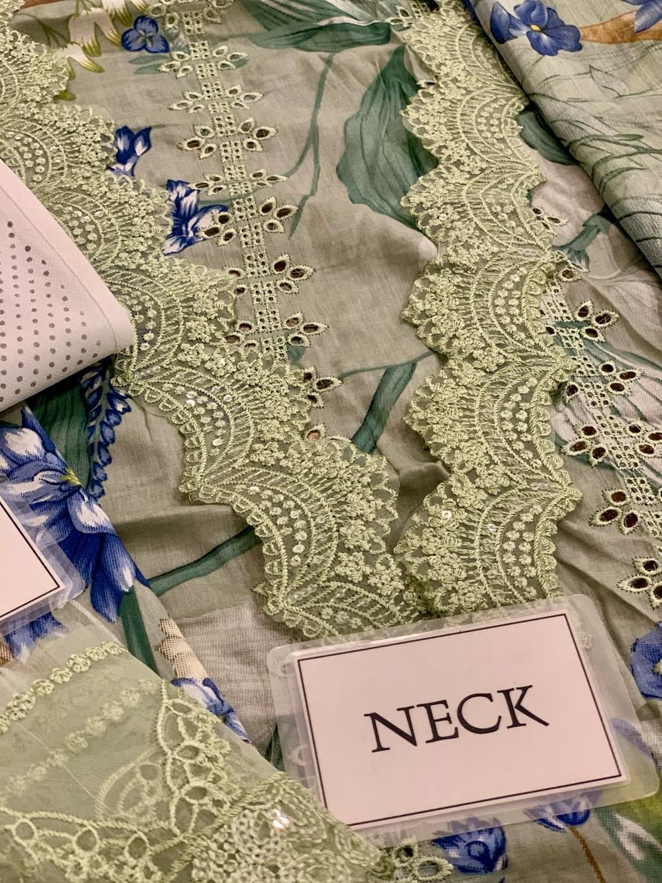 *Printed Lawn With Fully Heavy Embroidered Schifflie Front With Heavy Embroidered Spengle Work Daman Border With Embroidered Spengle Work Neckline*
