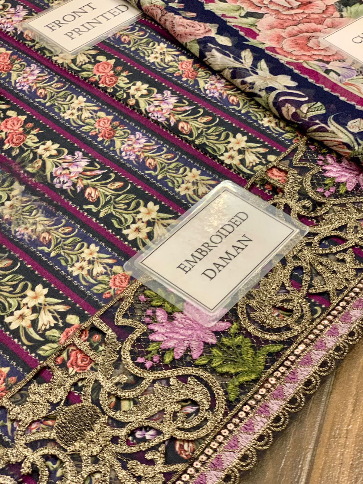 *Printed lawn front with heavy embroidered spengle work neckline with heavy embroidered spengle work daman boarder with cut work*