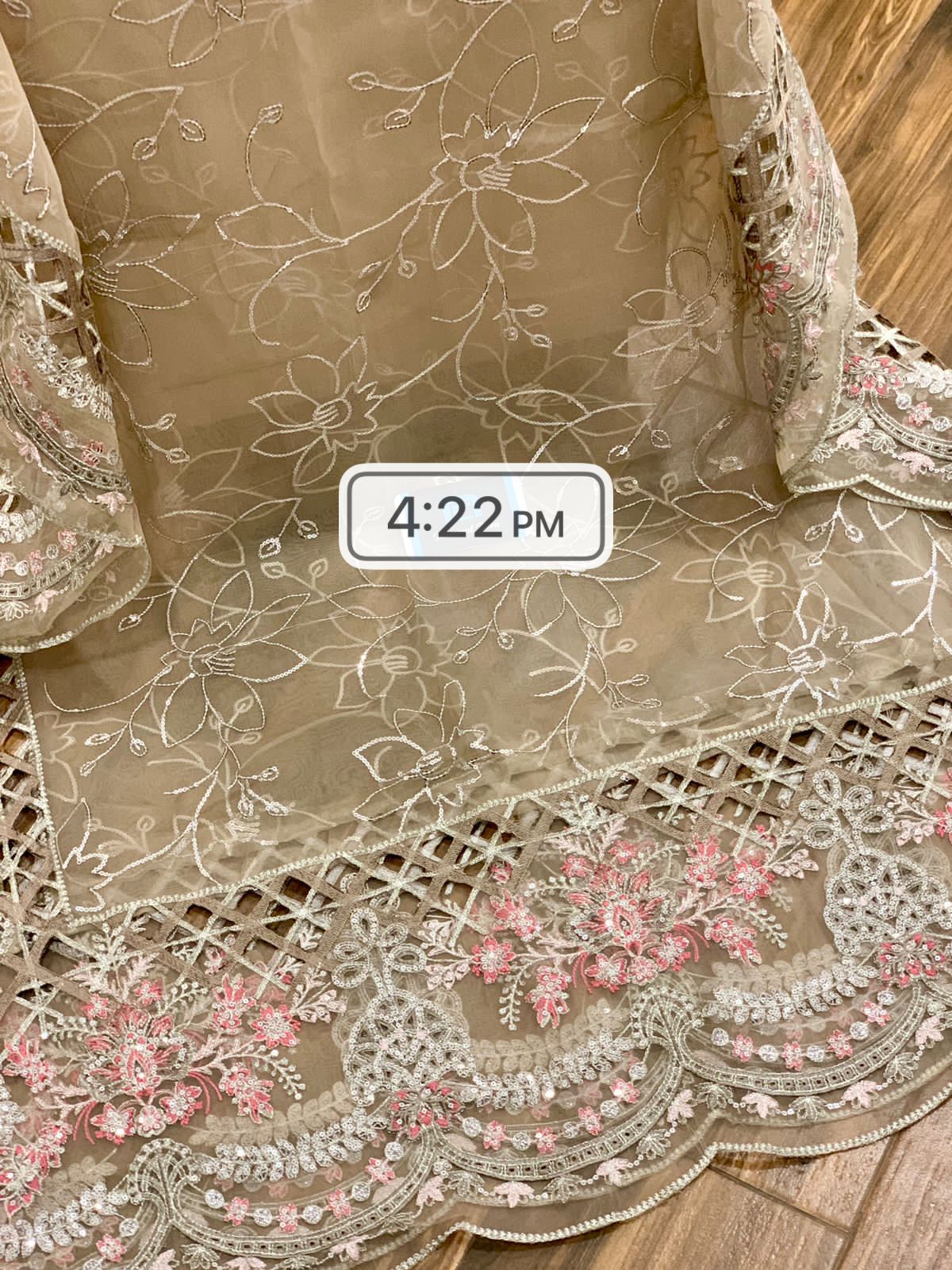 *organze fully heavy embroidered spengle work 6 kali front with fully cut work with heavy embroidered spengle work daman boarder attach with fancy tulses attach*