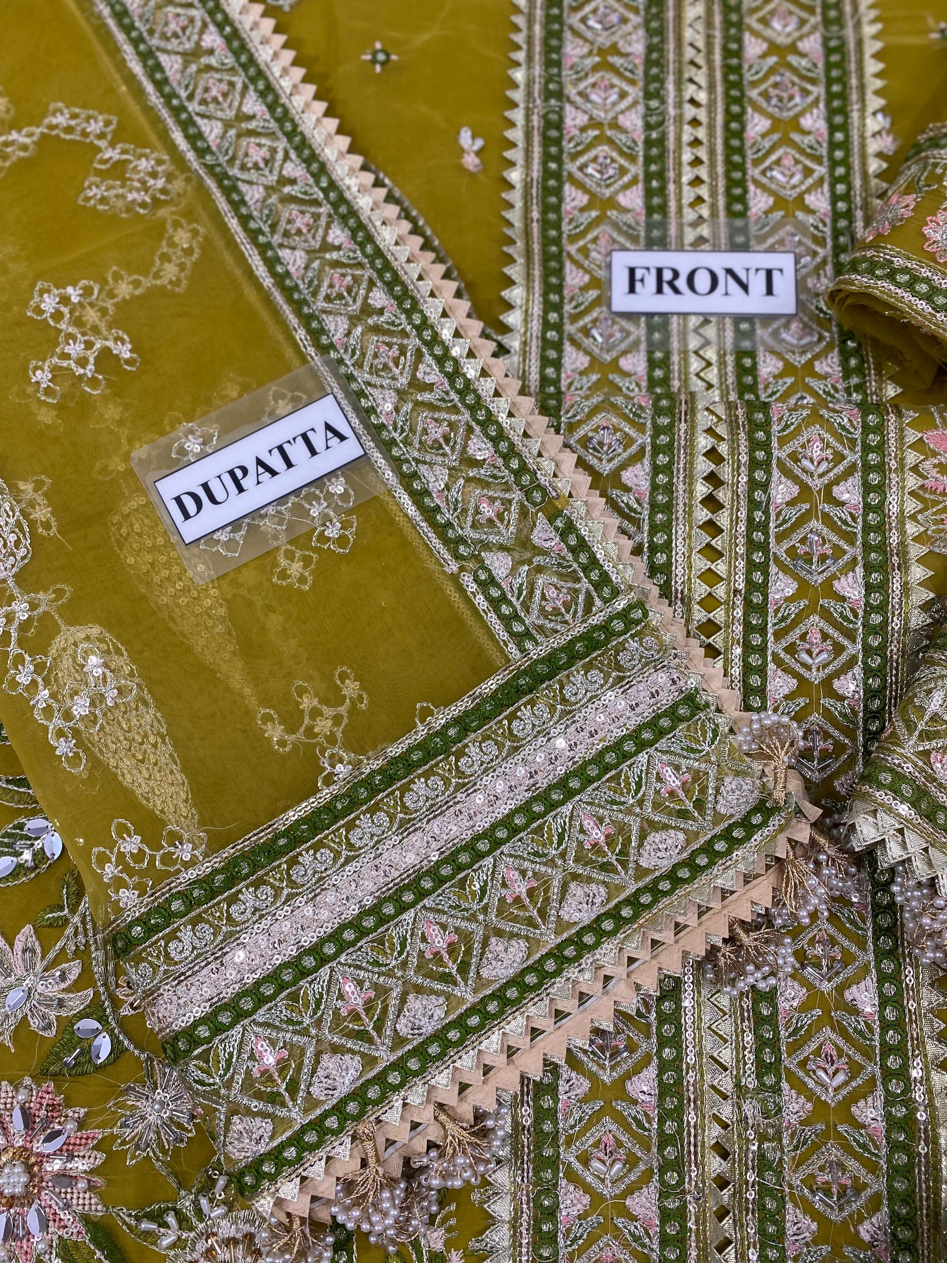 HEAVY ORGANZA EMBROIDERED FRONT EMBELISH WITH HEAVY HANDWORK WITH GOTA LACE WORK AND HEAVY TUSSELS ATTACHED