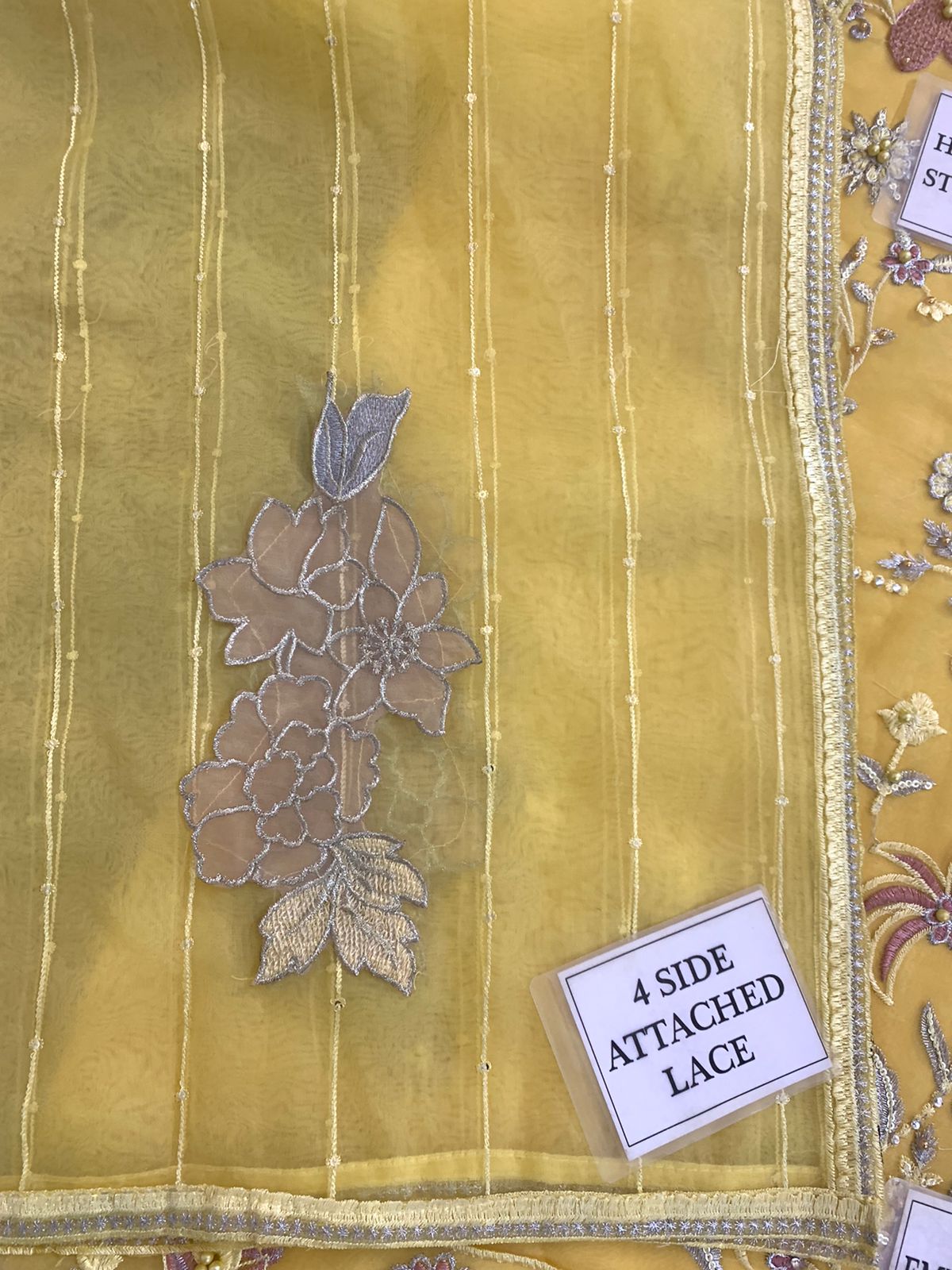 EMBROIDERED ORGANZA DUPATTA WITH 4 SIDE ATTACHED LACE WITH ATTACHED EMBROIDERED APPLIQUE PATCH