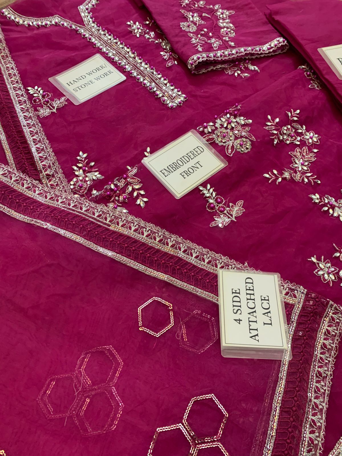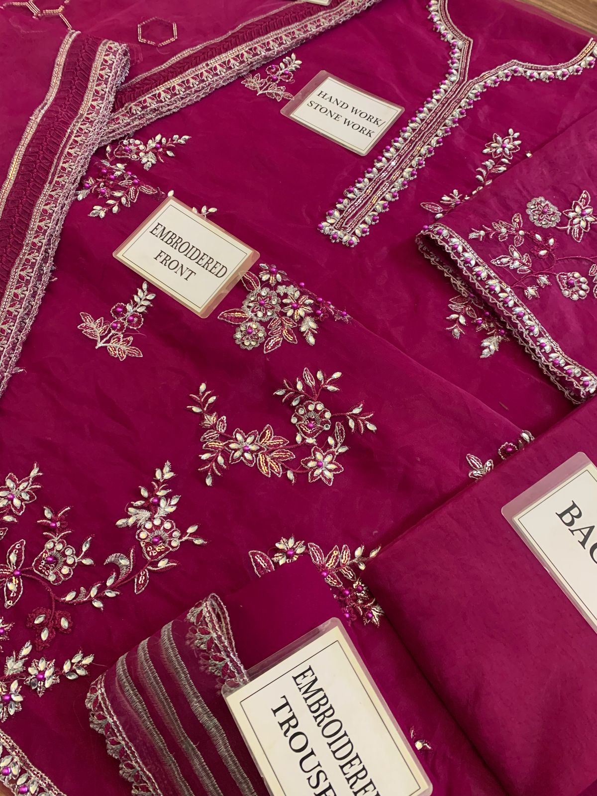 HEAVY EMBROIDERED ORGANZA FRONT EMBELLISHED WITH HANDAWORK AND STONE WORK