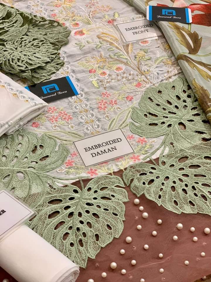 lawn fully heavy alternet embroidered multi threat front with fully heavy alternet embroidered scifflie daman boarder with fully heavy beats work with embroidered chak lace