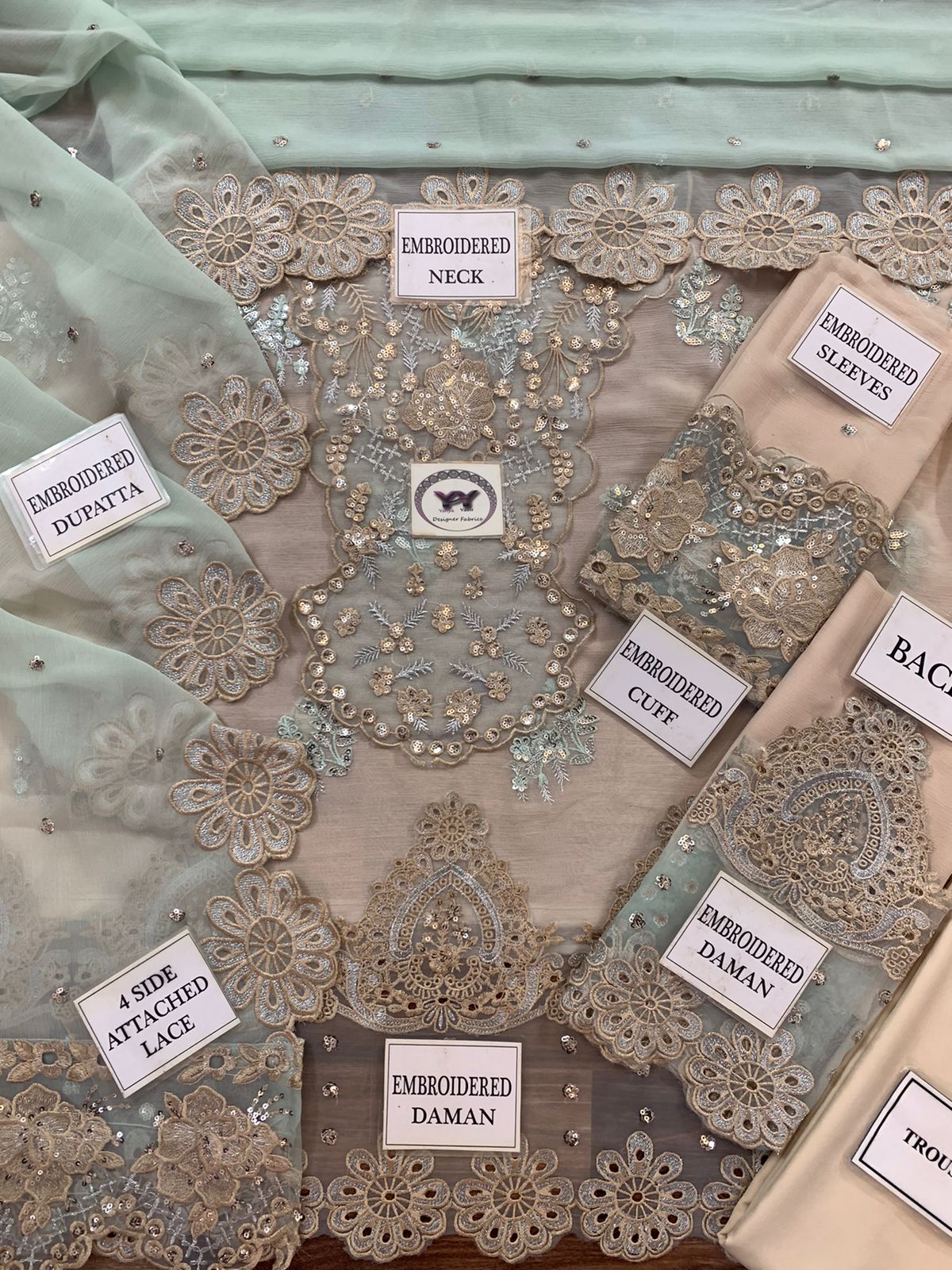 Chiffon Embroidered Front with Embroidered Neck And Daman given On Organza