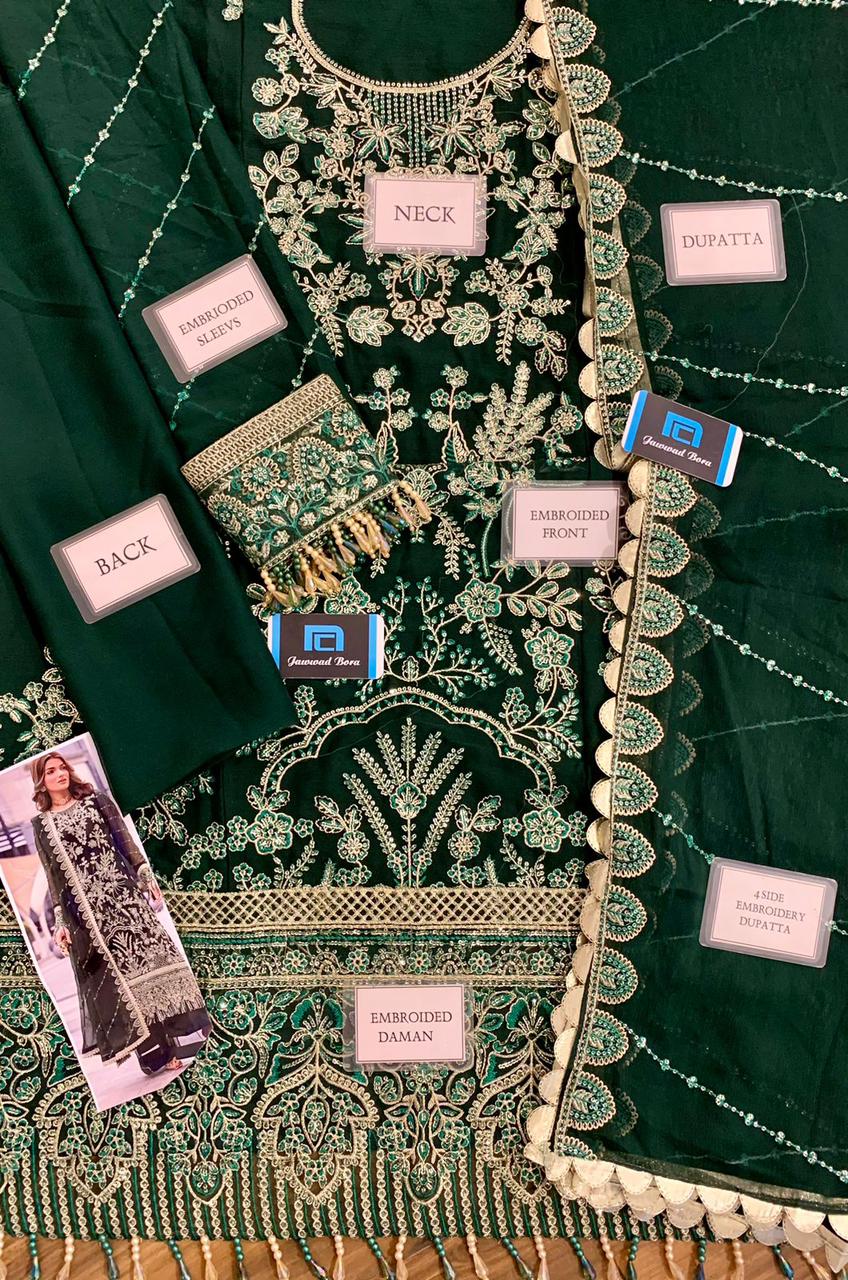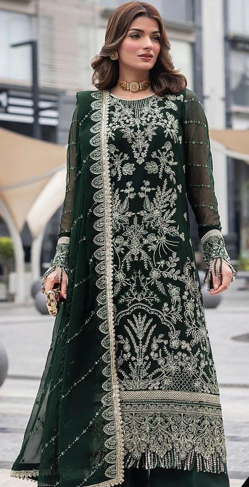 *Chiffon fully heavy embroidered spengle work centre panel front with heavy embroidered spengle work left & right panel attach with heavy embroidered spengle work daman boarder with fancy tulses attach*