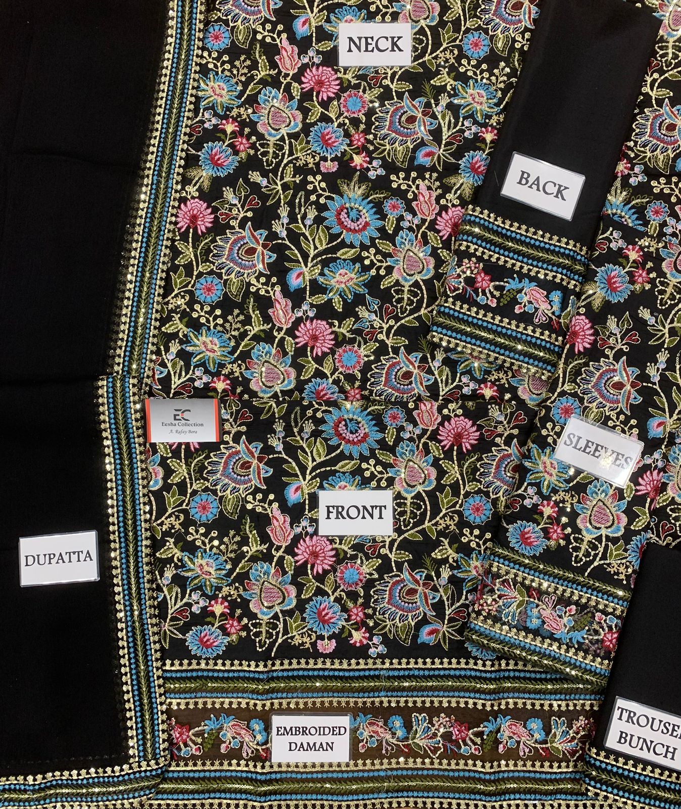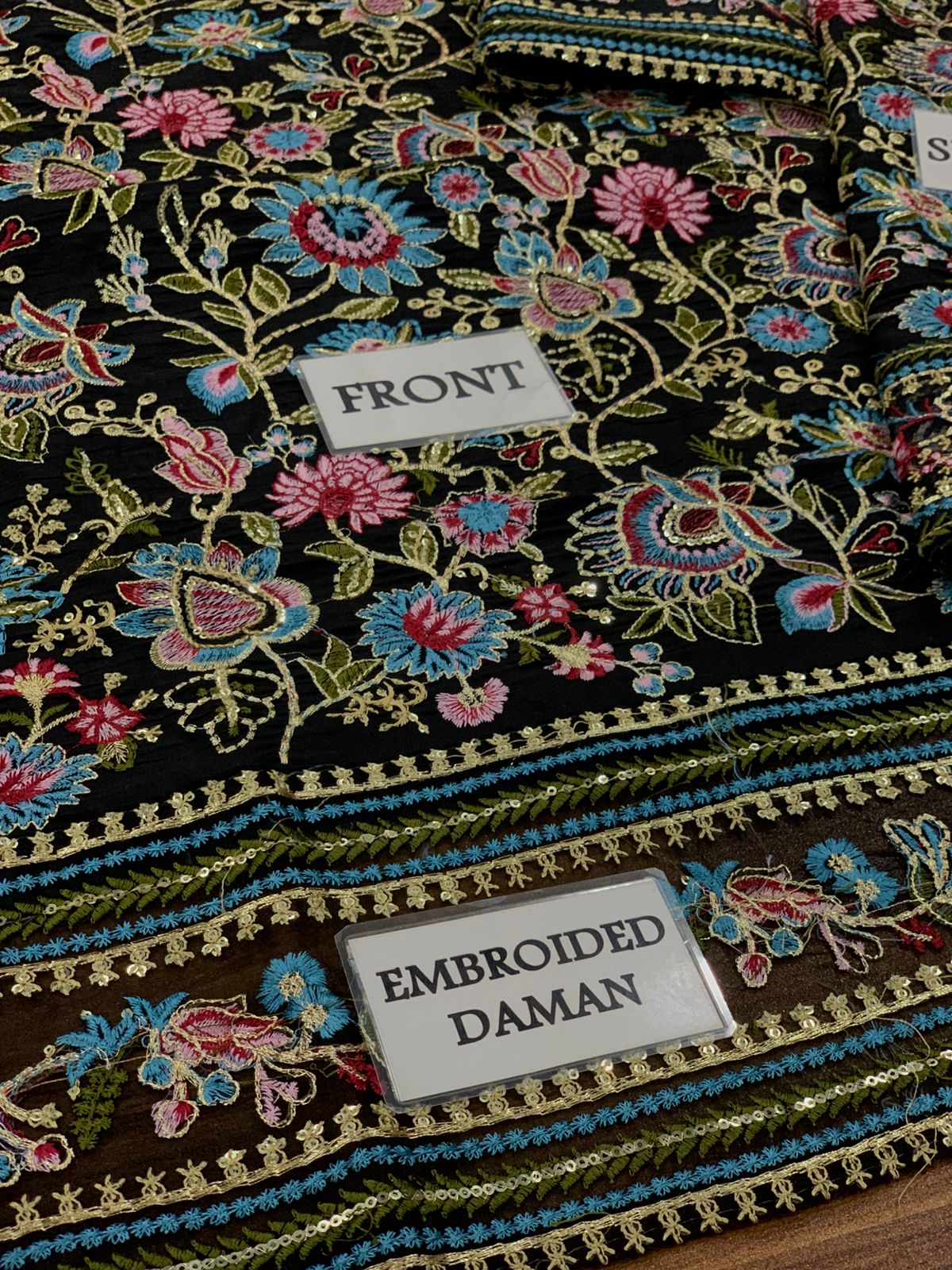 •Plain Raw Silk Back with heavy embroidered daman border