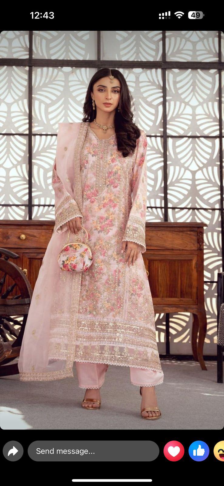 ORGANZA EMBROIDERED SEQUENCE FRONT EMBELISH WITH HANDWORK AND HANGING TUSSLES ON DAMAN