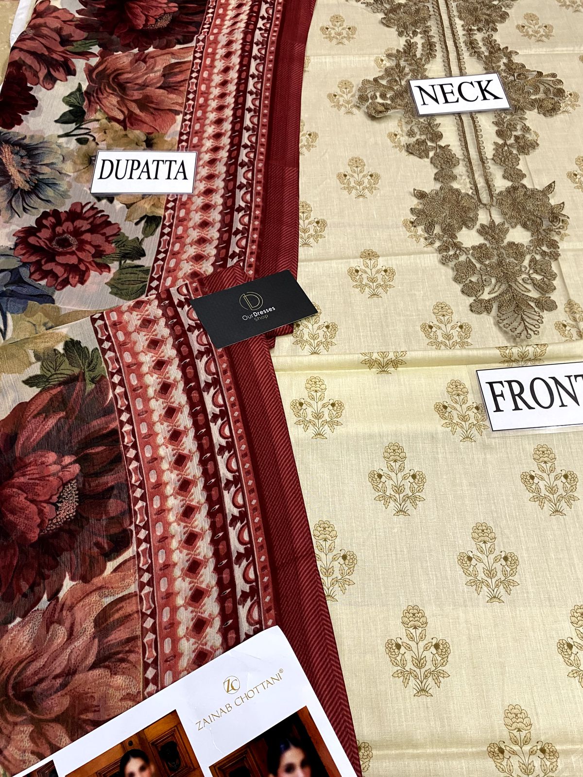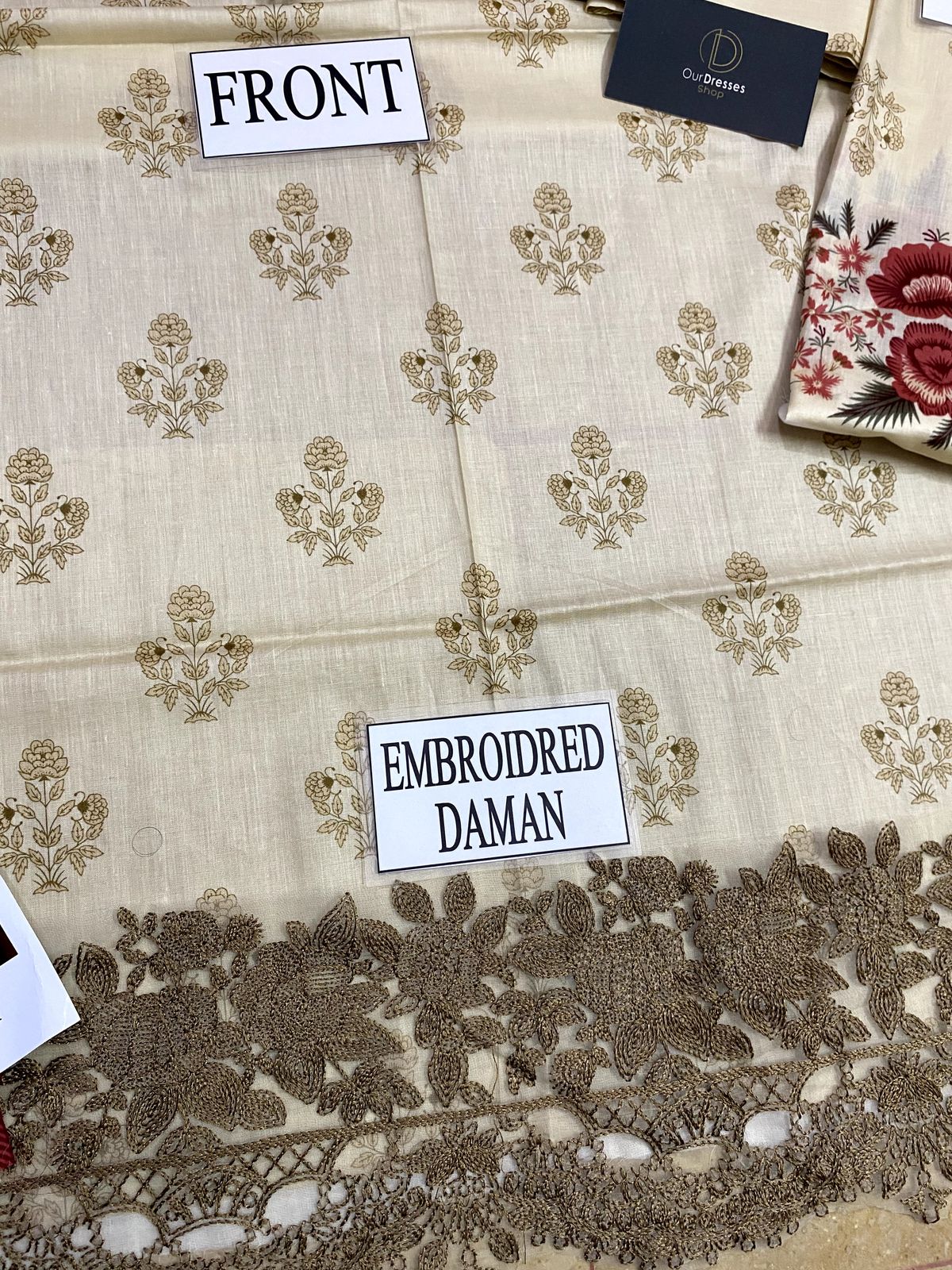 *Printed lawn front with heavy embroidered spengle work neck patch & heavy daman boarder*