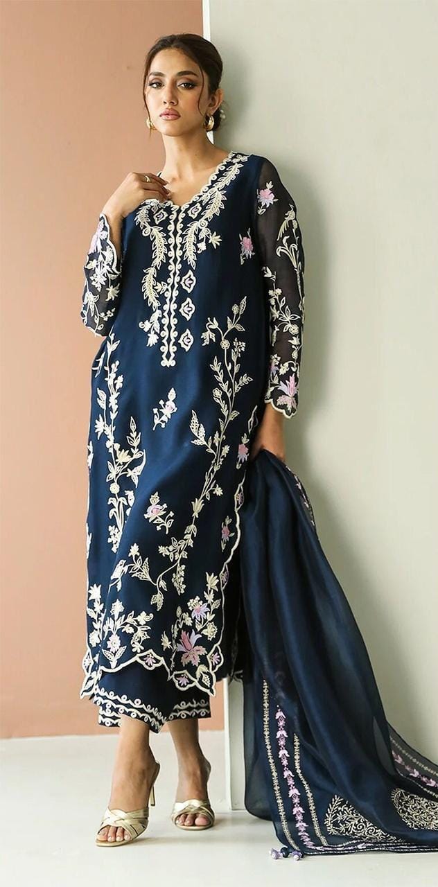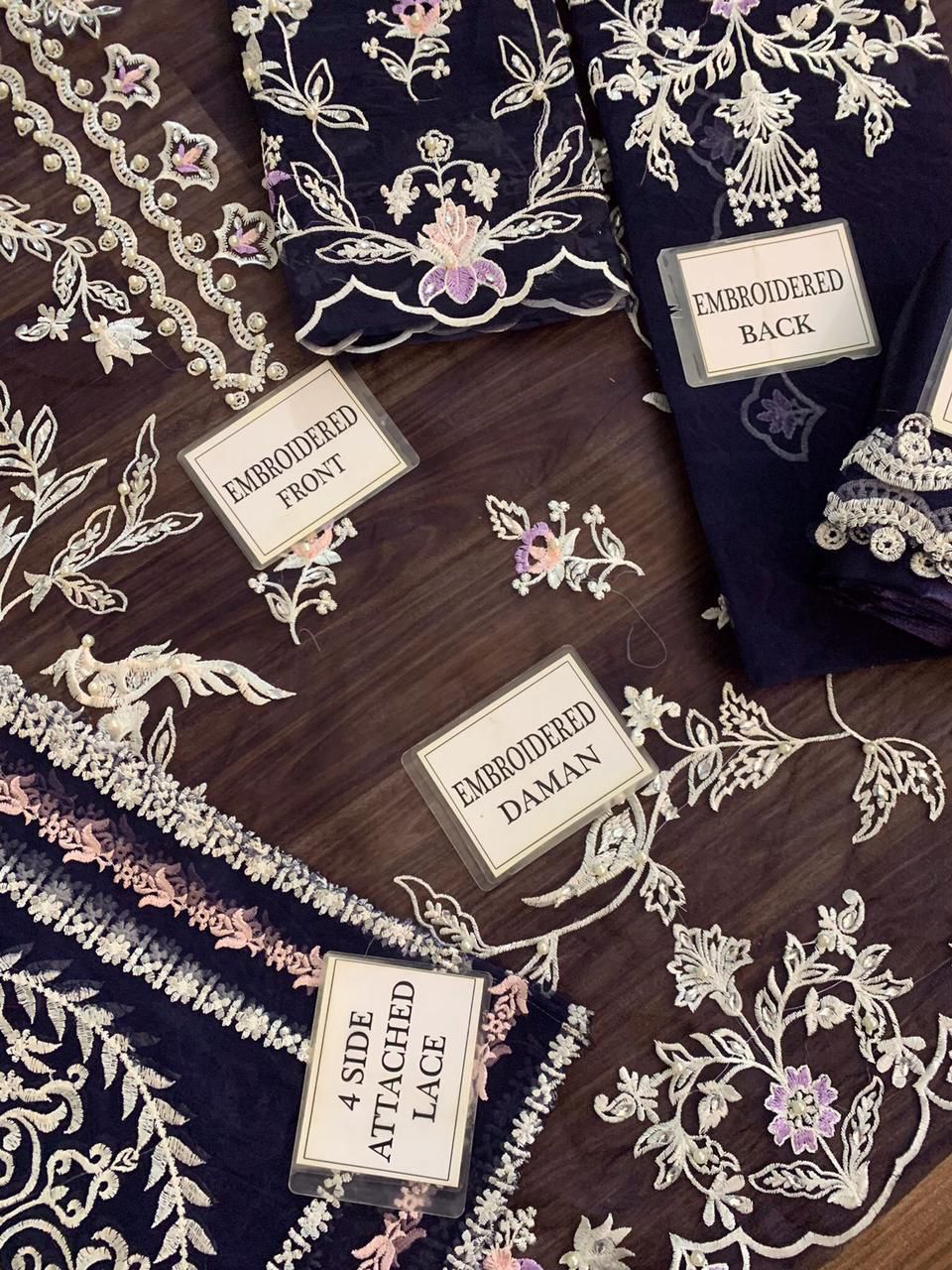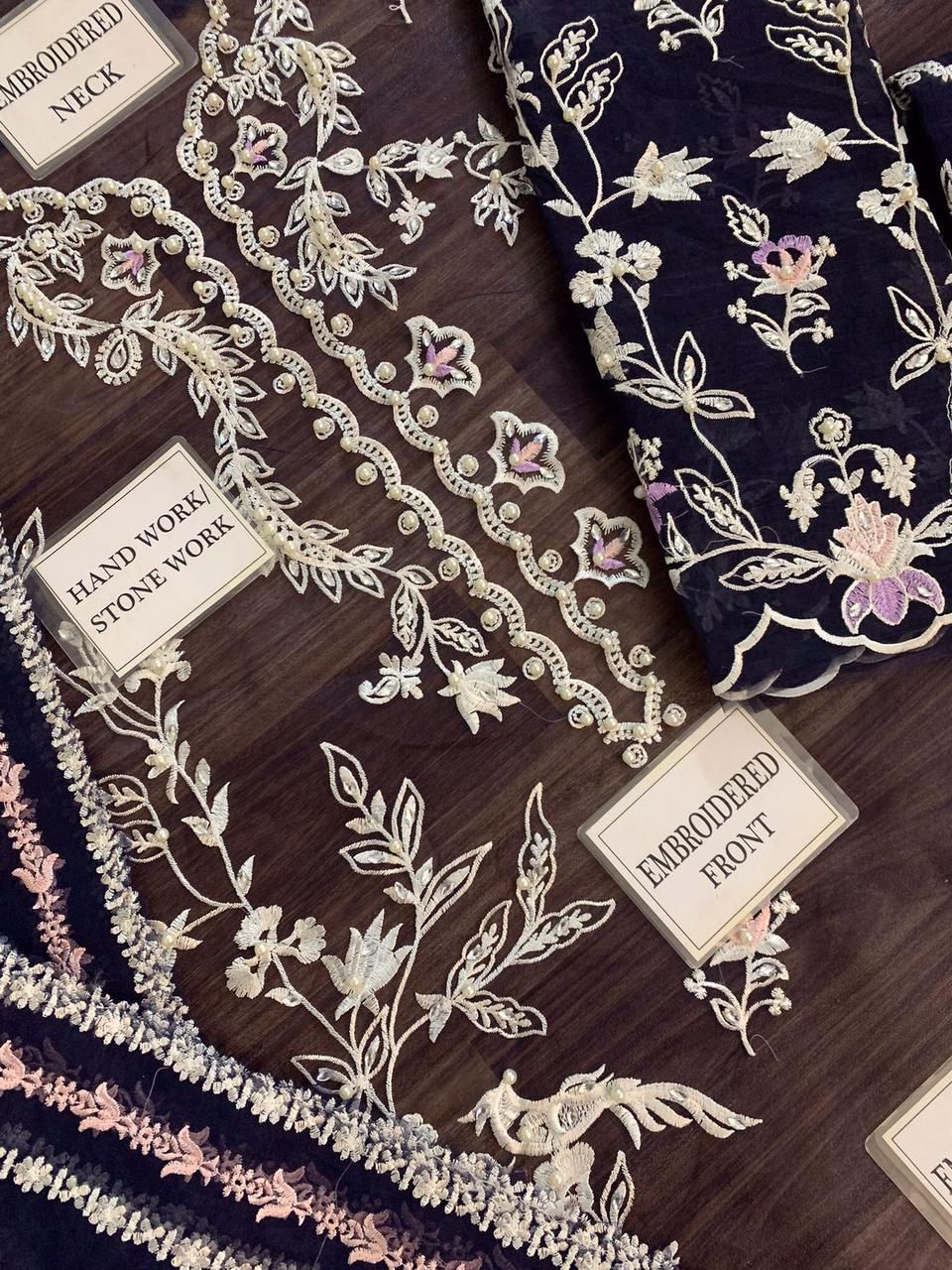 HEAVY EMBROIDERED ORGANZA FRONT EMBELLISHED WITH HANDWORK AND STONE WORK WITH HEAVY EMBROIDERED NECK ON FABRIC EMBELLISHED WITH STONE WORK WITH HEAVY EMBROIDERED CUTWORK DAMAN ON FABRIC