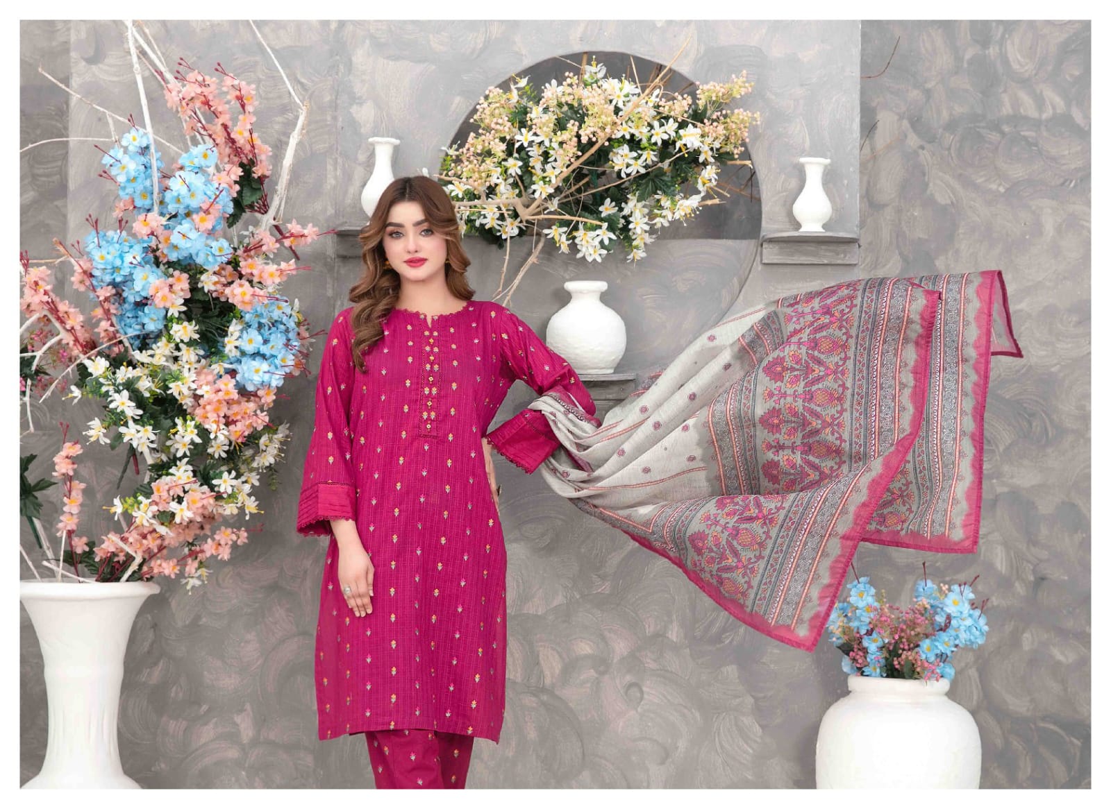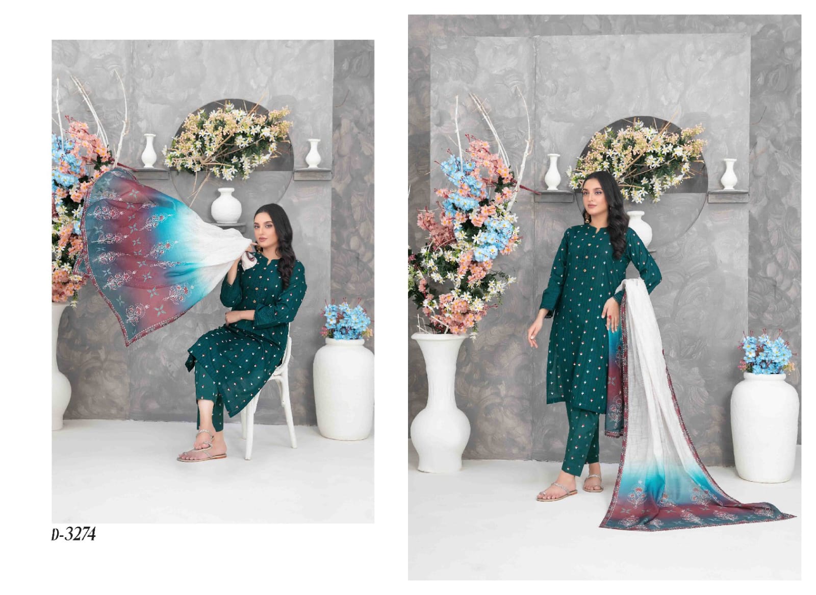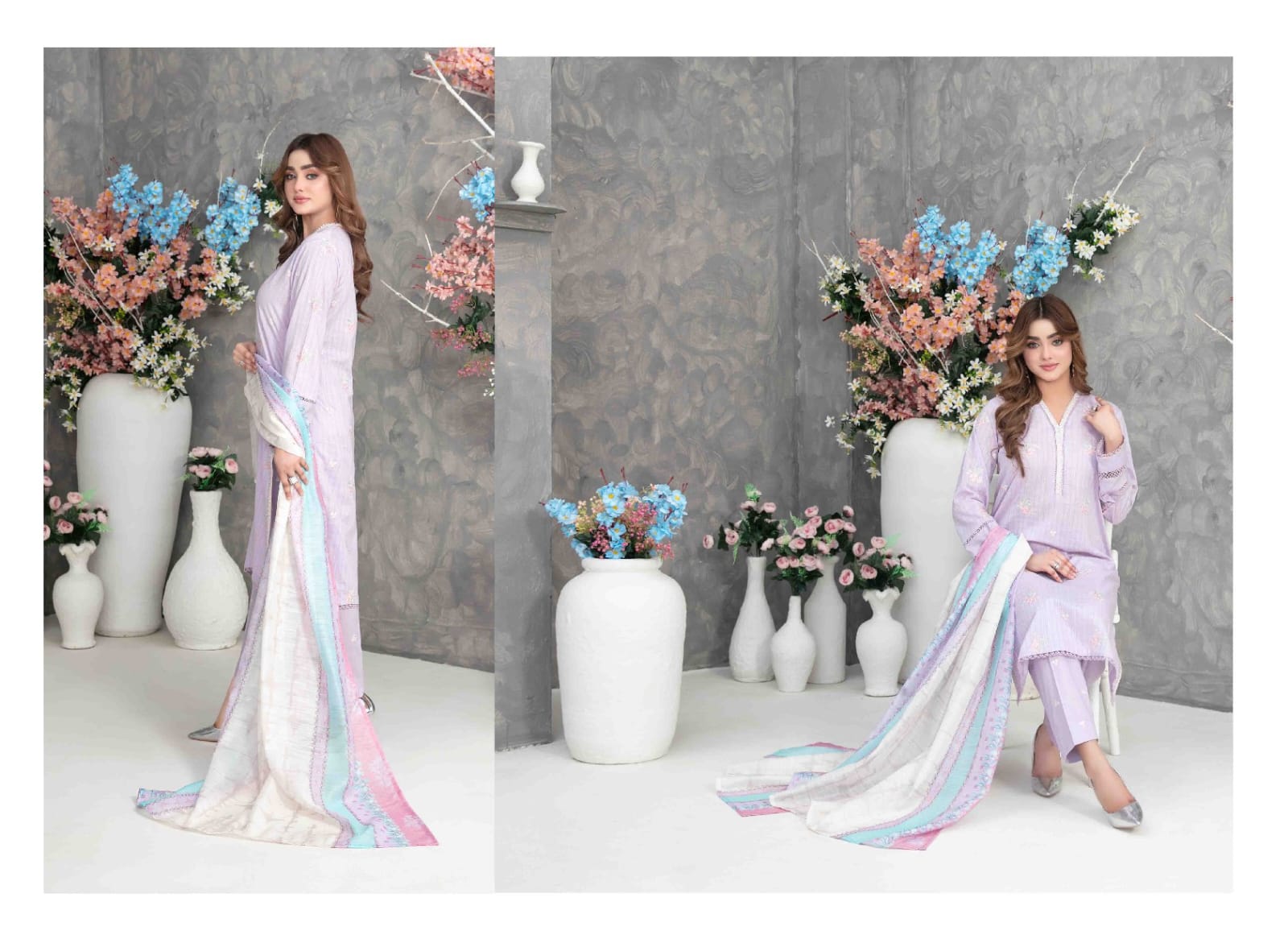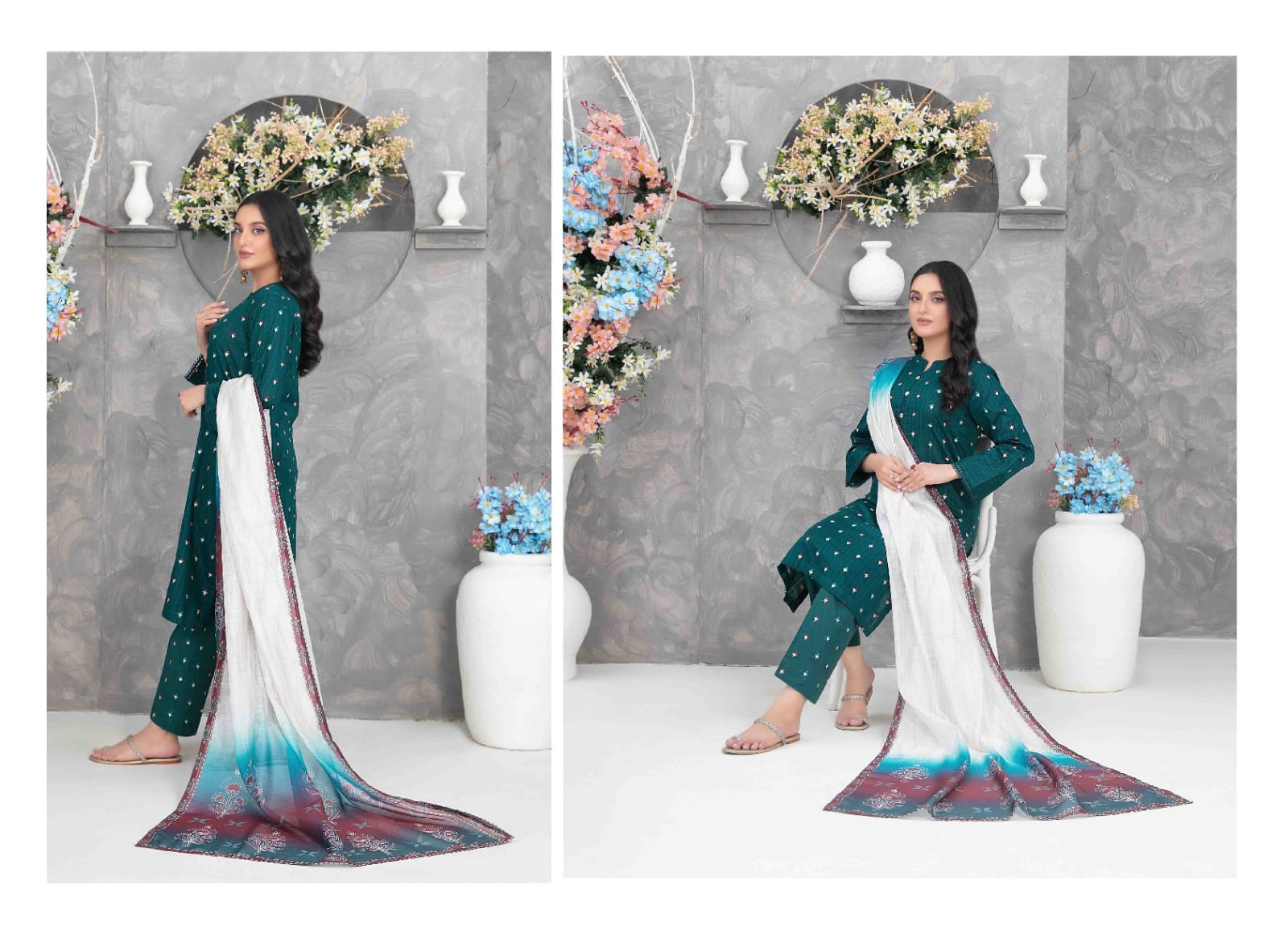 Stitched Embroidered Slub Lawn Shirt Design's with Embellishments with Digital Printed Dupatta & Stitched Embroidered Cotton Trouser